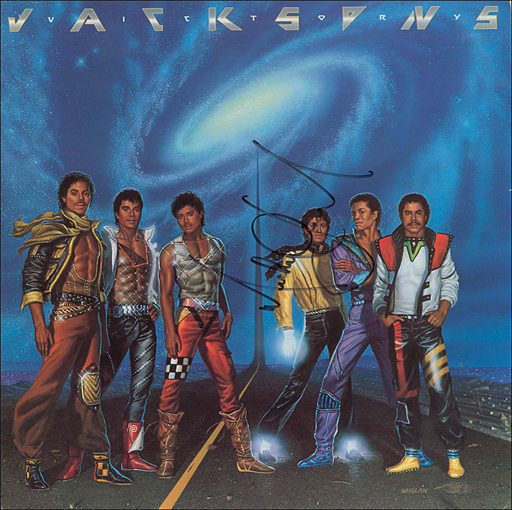 Victory album by the Jacksons signed vertically on the front in black felt tip, “Michael Jackson.” In fine condition, with some edge and corner wear. The record is not included.