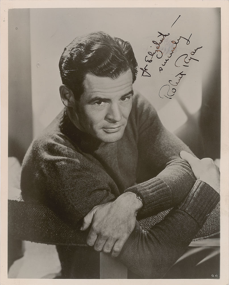 Glossy 8 x 10 studio portrait of Ryan wearing a knit sweater, signed and inscribed in fountain pen, "To Elizabeth—sincerely, Robert Ryan.” In fine condition.
