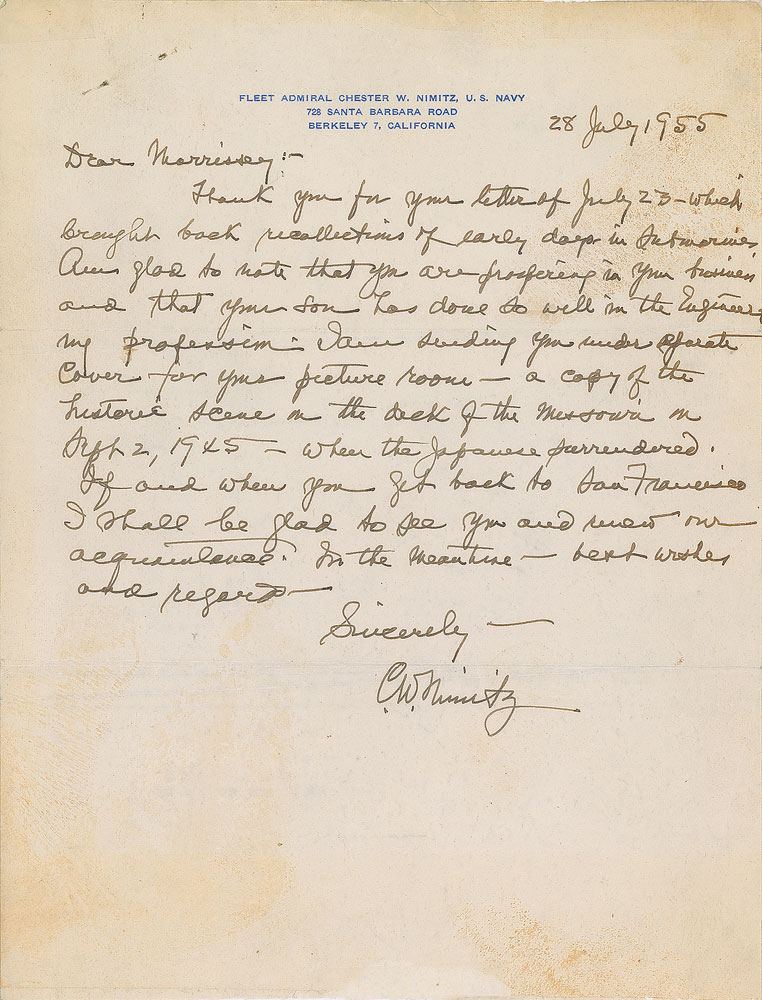 ALS signed “C. W. Nimitz,” one page, 8 x 10.5, personal letterhead, July 28, 1955. Letter to "Morrissey," in part: "Am glad to note that you are prospering in your business and that your son has done so well in the Engineers, my profession. I am sending you…a copy of the historic scene on the deck of the Missouri on Sept. 2, 1945—when the Japanese surrendered. If and when you get back to San Francisco I shall be glad to see you." In very good condition, with scattered soiling, light toning and creasing, pinholes to upper left, and pieces of clear tape at the top and bottom edges.