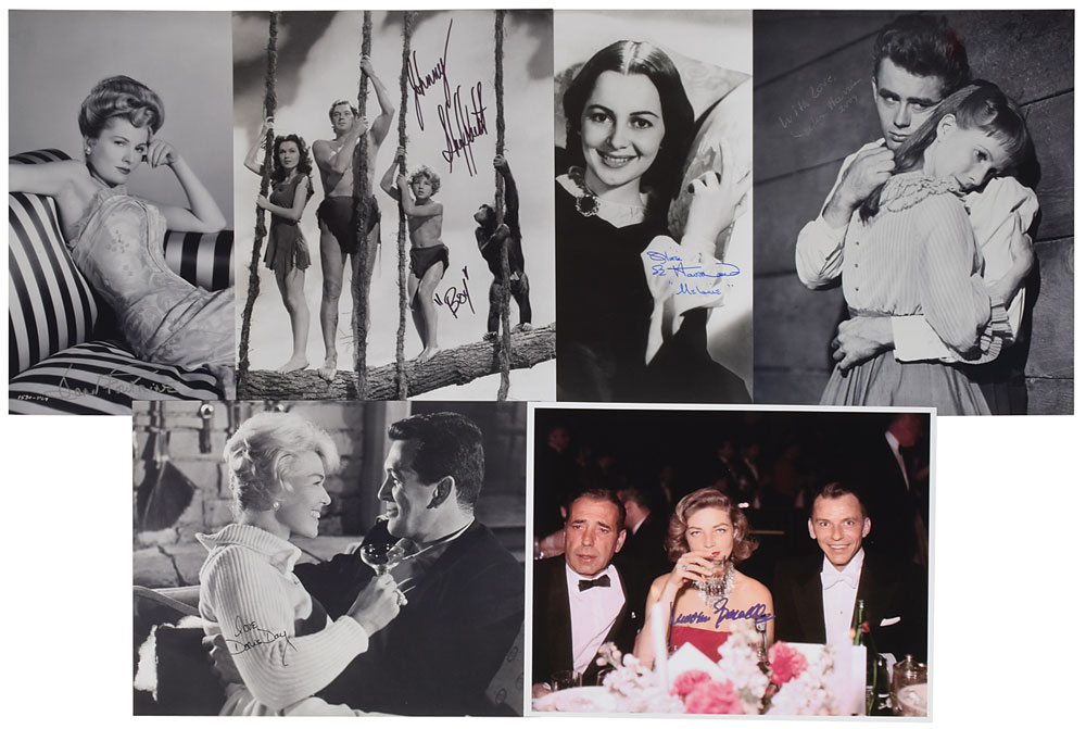 Grouping of six photos, glossy and satin-finish, 11 x 14 and 14 x 11, each signed in ink or felt tip by a notable Hollywood legend, including: Lauren Bacall, Doris Day, Joan Fontaine, Olivia de Havilland, Julie Harris, and Johnny Sheffield. In overall fine condition.