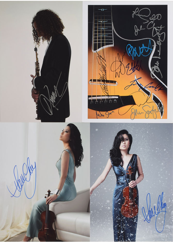 Four photos: a color glossy 11 x 14 photo of a guitar, signed in ink and felt tip by eleven jazz legends: John McLaughlin, Pat Martino, Pat Metheny, Larry Carlton, Al DiMeola, Earl Klugh, Larry Coryell, Eric Johnson, John Abercrombie, Mike Stern, and John Scoefield; a color glossy 11 x 14 three-quarter-length profile photo of Kenny G holding his saxophone, signed in silver ink; a color satin-finish 11 x 14 photo of Sarah Chang holding her violin amidst swirling snowflakes, signed in blue felt tip; and a color satin-finish 11 x 14 photo of Chang seated on the arm of a couch, violin in hand, signed in blue felt tip. In overall fine condition.