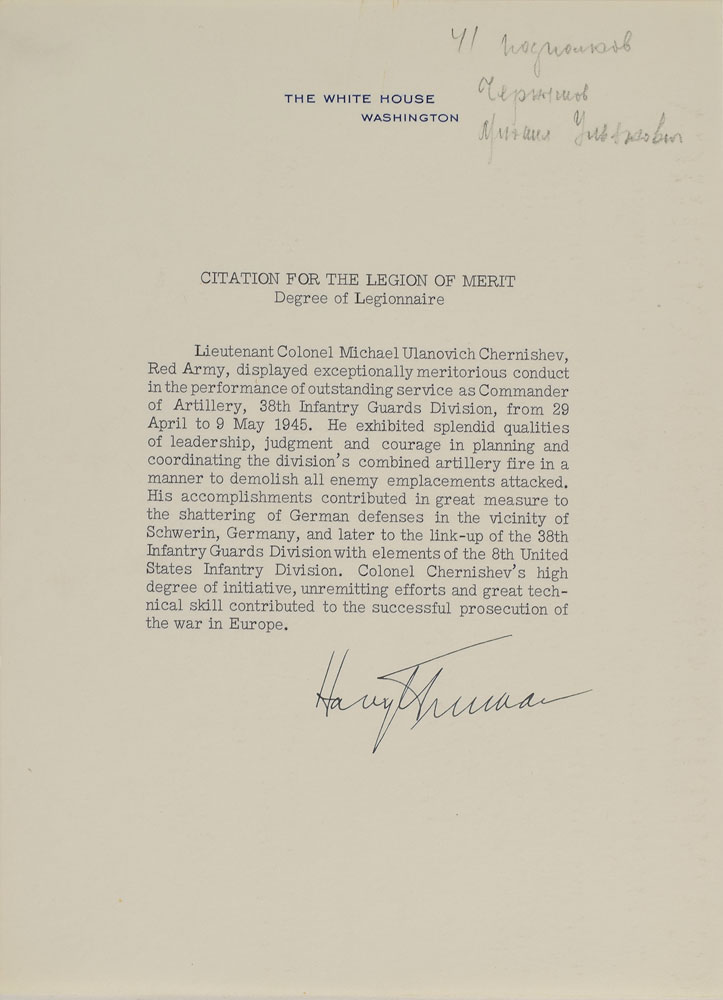 DS as president, one page, 8 x 10.25, no date but circa 1946. A "Citation for the Legion of Merit, Degree of Legionnaire," in full: "Lieutenant Colonel Michael Ulanovich Chernishev, Red Army, displayed exceptionally meritorious conduct in the performance of outstanding service as Commander of Artillery, 38th Infantry Guards Division, from 29 April to 9 May 1945. He exhibited splendid qualities of leadership, judgment and courage in planning and coordinating the division's combined artillery fire in a manner to demolish all enemy emplacements attacked. His accomplishments contributed in great measure to the shattering of German defenses in the vicinity of Schwerin, Germany, and later to the link-up of the 38th Infantry Guards Division with elements of the 8th United States Infantry Division. Colonel Chernishev's high degree of initiative, unremitting efforts and great technical skill contributed to the successful prosecution of the war in Europe." Includes the Legion of Merit certificate awarded to Chernishev, one page, 12 x 10, April 9, 1946. In fine condition.