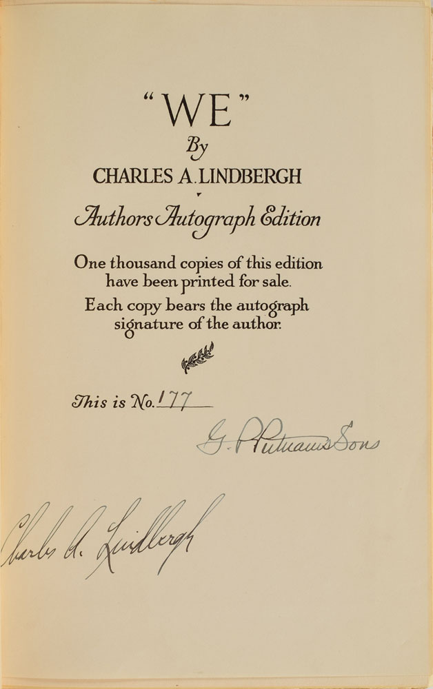 Signed book: We. Authors autograph edition, limited issue, numbered 177/1000. NY: G. P. Putnam's Sons, 1927. Hardcover, 6.75 x 9.75, 308 pages. Signed on the colophon in fountain pen by Lindbergh, "Charles A. Lindbergh," and by the publisher. Autographic condition: fine. Book condition: VG/None, with some scuffing and staining to spine, and bumped corners.