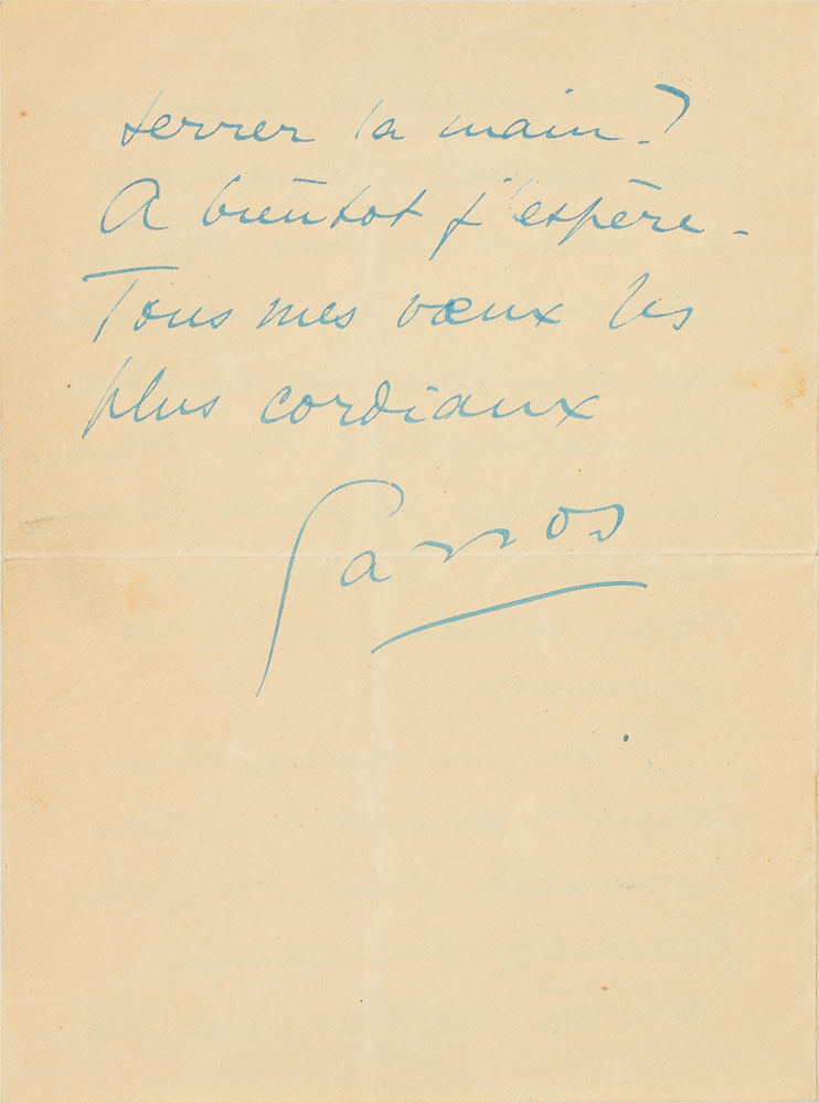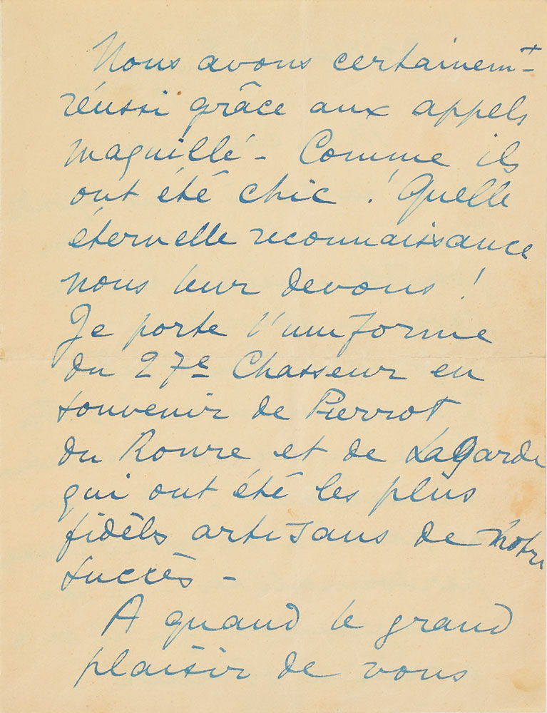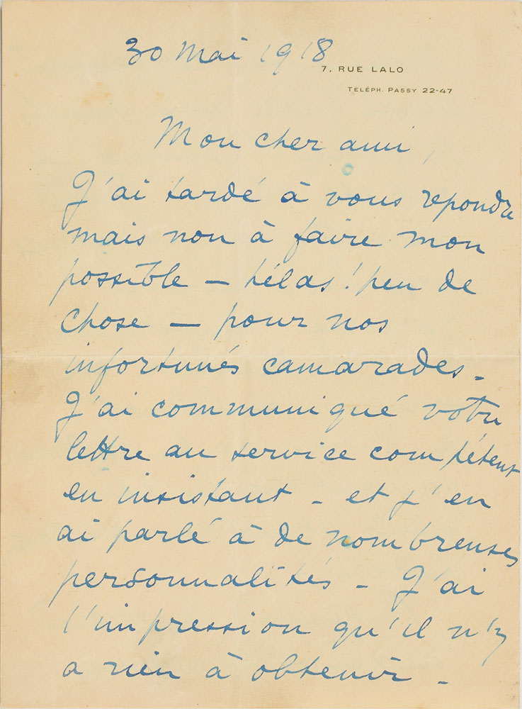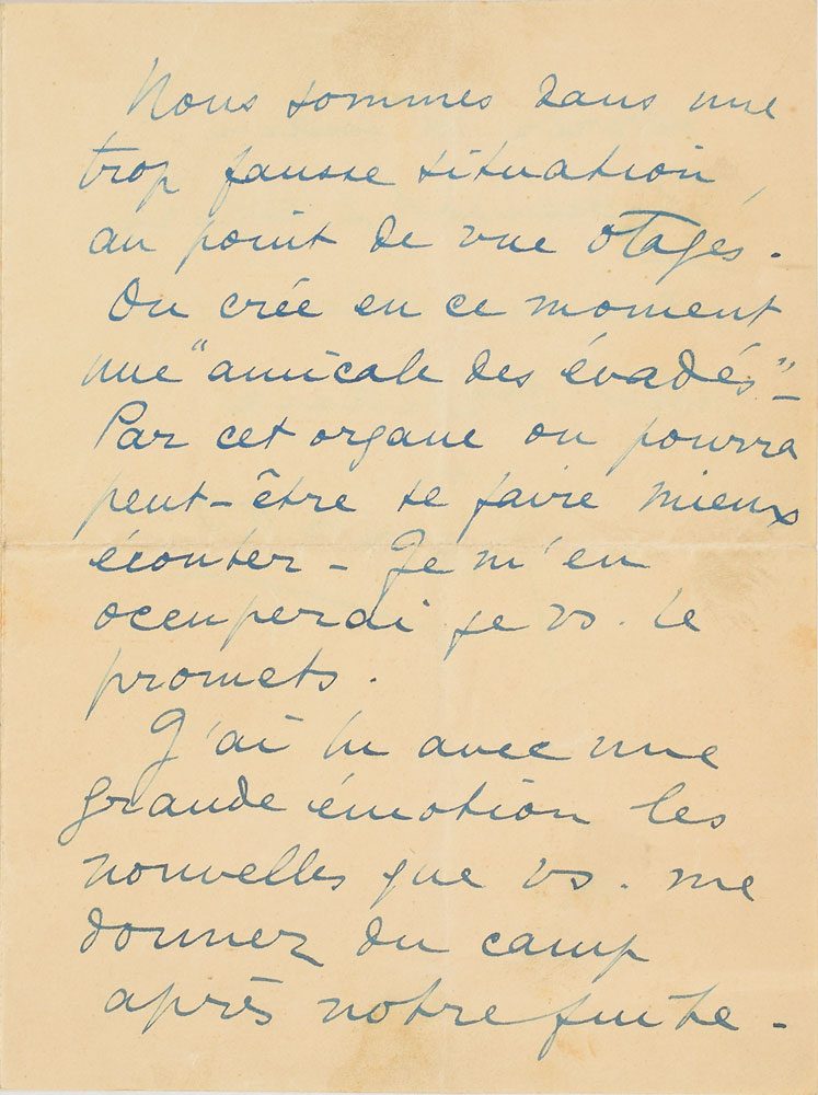 Early French aviator and a fighter pilot (1888-1918) during World War I. A tennis center was named after him in the 1920s, the Stade de Roland Garros, the stadium that accommodates the French Open tournament, which is officially called Les internationaux de France de Roland-Garros (the 'French Internationals of Roland Garros'). ALS in French, signed “Garros,” four pages on two adjoining sheets, 5.25 x 7.25, May 30, 1918. In part (translated): "I have taken a long time to answer you but meanwhile I was doing everything possible unfortunately not a lot for our unfortunate comrades. I have communicated your letter to the competent service and have insisted about it with numerous personalities. I have the impression that there is nothing to be obtained. We are in a true delicate situation regarding the hostages. We have in this moment an association of the people who have evaded prison…Through this organ we may perhaps be better listened to. I will take care of this I promise you. I have read with great emotion the news you have given me of the camp after our escape…I use the uniform of the 27th regiment in remembrance of Pierrot Du Roure and of LaGarde who have been the most faithful makers of our success." In fine condition. Garros had been captured by the Germans in 1915 and held for nearly three years before escaping in February 1918, mere months before writing this letter. He would be killed in action in October, shot down near Vouziers, Ardennes, a month before the end of the war and one day before his 30th birthday.