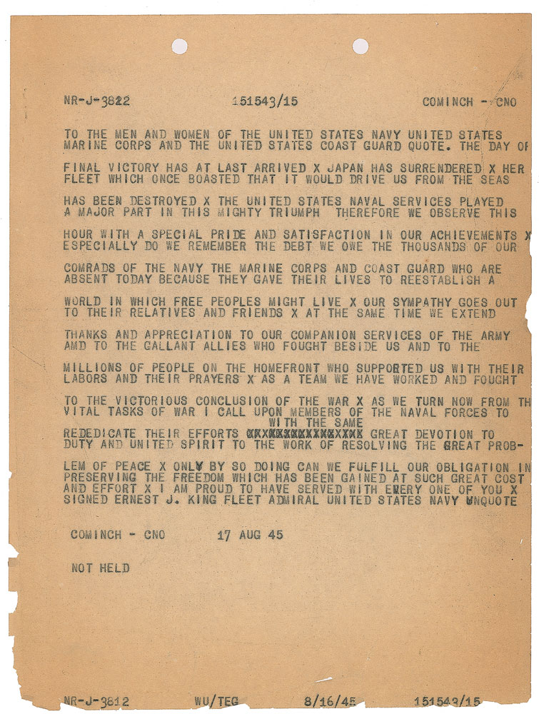 Rare original teletype announcing the surrender of Japanese forces, one page, 8 x 10.5, August 17, 1945. This teletype was received onboard the USS Denver, a Cleveland-class light cruiser, following her return from Okinawa hunting Japanese ships off the China coast. In full: “To the men and women of the United States Navy United States Marine Corps and the United States Coast Guard Quote. The day of final victory has at last arrived. Japan has surrendered. Her fleet which once boasted that it would drive us from the seas has been destroyed. The United States Naval Services played a major role in this mighty triumph therefore we observe this hour with a special pride and satisfaction in our achievements. Especially do we remember the debt we owe the thousands of our comrades of the Navy the Marine Corps and Coast Guard who are absent today because they gave their lives to reestablish a world in which free peoples might live. Our sympathies go out to their relatives and friends. At the same time we extend thanks and appreciation to our companion service of the Army and to the gallant allies who fought beside us and the millions of people on the homefront who supported us with their labors and their prayers. It is as a team we have worked and fought to the victorious conclusion of the war. As we turn now from the vital tasks of war I call upon all members of the Naval Services to rededicate their efforts with the same courage devotion to duty and united spirit to the work of resolving the great problems of peace. Only by so doing can we fulfill our obligation in preserving the freedom which has been gained at such great cost and effort. I am proud to have served with every one of you. Signed Ernest J. King Fleet Admiral United States Navy Unquote.” In fine, albeit fragile condition, with a tear to the bottom edge and chipping to the edges not affecting any text.