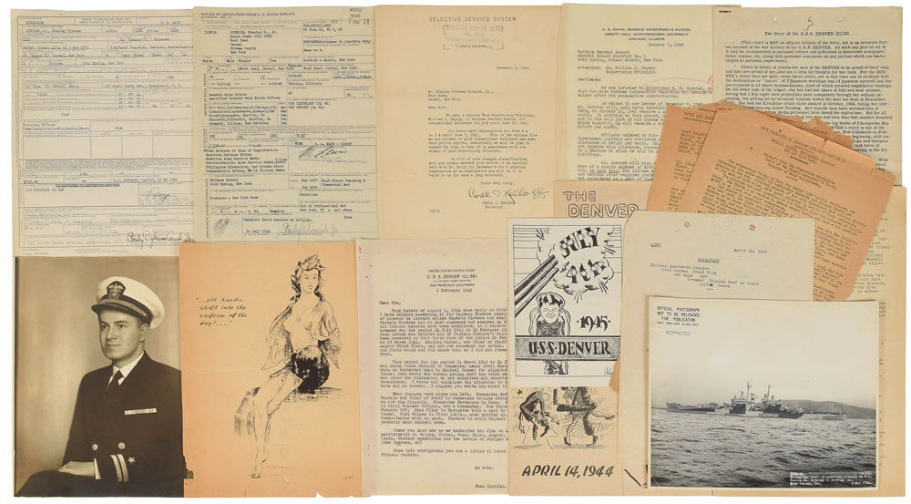 Accompanied by additional ephemera including naval operations reports describing the USS Denver's battles at sea and other duties in the Pacific, correspondence, orders, administrative documents, shipboard activity ephemera, and photographs collected by one of the officers aboard the Denver, Lieutenant Commander Stanley D. Cornish, Jr., giving a vivid recounting of life at sea during history's largest military conflict. The USS Denver destroyed numerous enemy ships and took fire herself—including a kamikaze pilot whose aircraft narrowly missed the Denver as it plunged into the sea—earning her 11 battle stars and a Navy Unit Commendation. An exceedingly rare and important historical document to have survived intact, especially from one of the American naval vessels that saw significant action during the war.