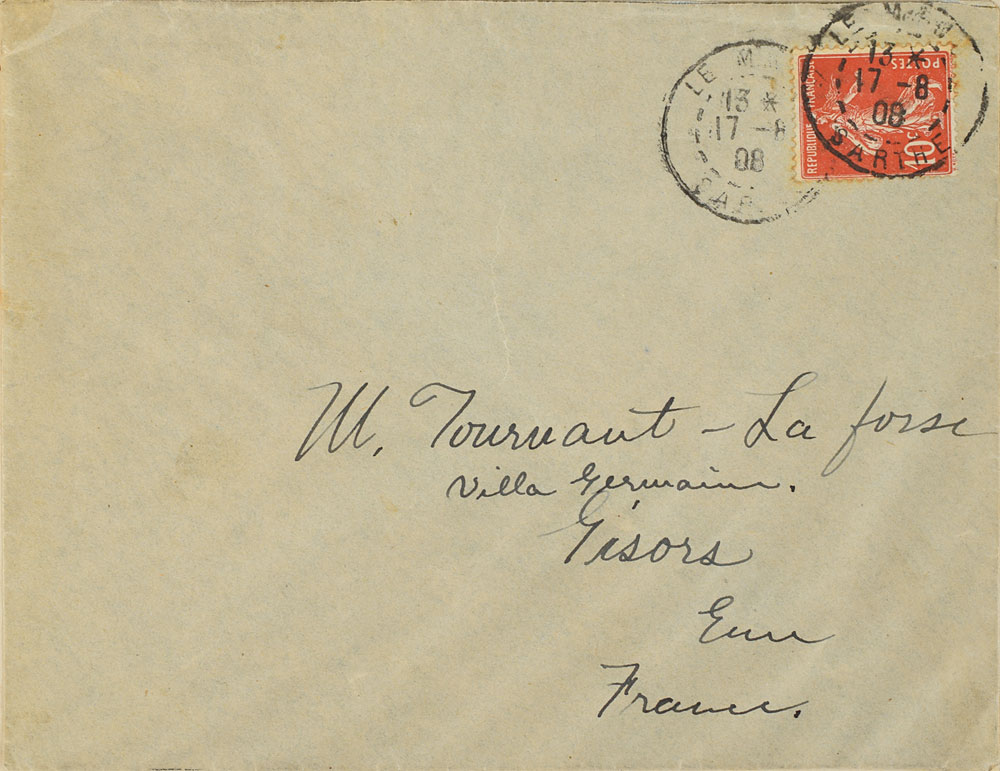 Sought-after ink signature, "Yours truly, Wilbur Wright,” on an off-white 5.25 x 8.25 autograph sheet bearing collector's notations and an affixed image of Wright. Affixed to a slightly larger presentation sheet, with original mailing envelope, addressed in a secretarial hand and postmarked Sarthe, August 17, 1908, affixed to the reverse. In fine condition. On August 8, 1908, Wilbur began official public demonstrations of the flyer at the Hunaudieres horse racing track near Le Mans, France, impressing many of the French aeronautical community in attendance, which included among them aviator and inventor Louis Bleriot. A sought-after signature from a most notable timeframe.