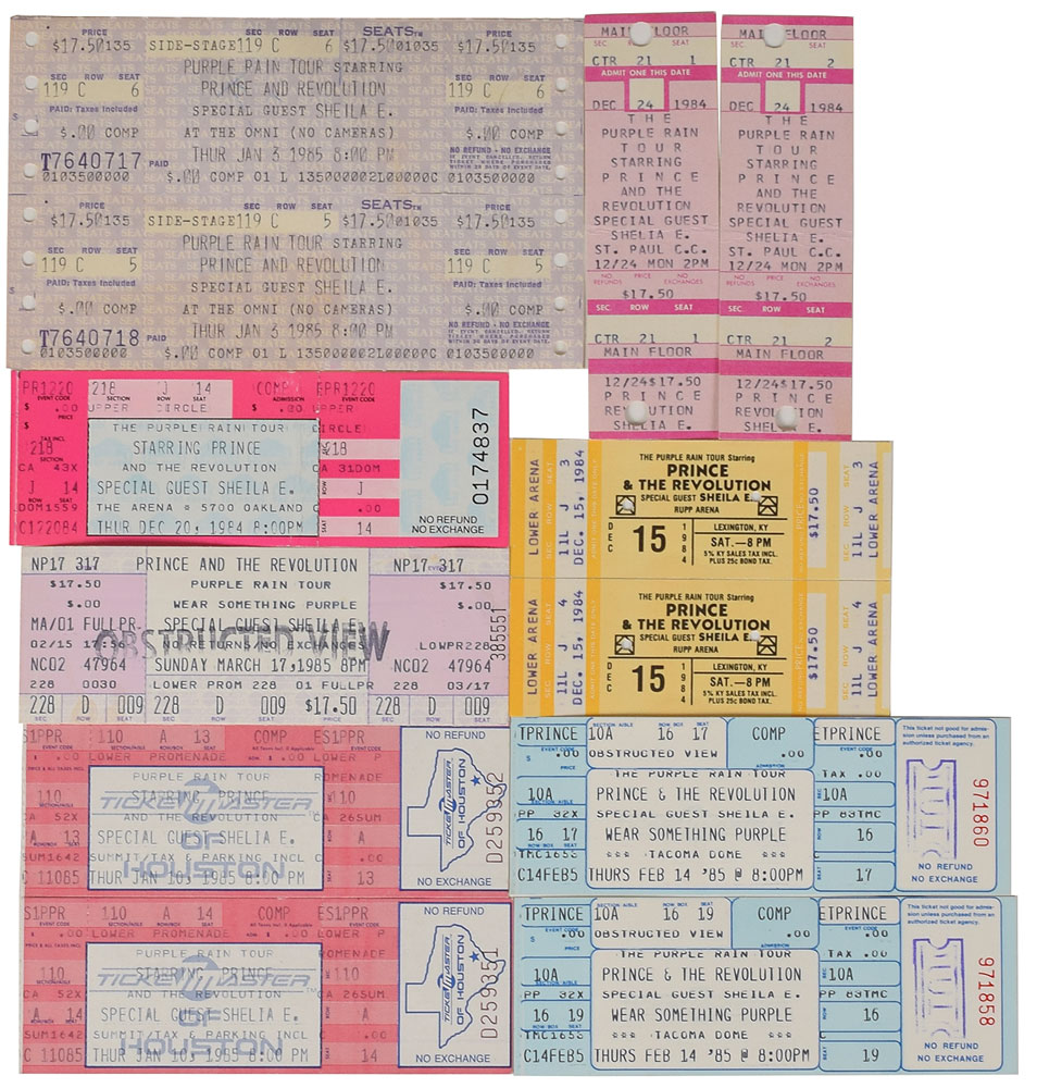 Collection of twelve concert tickets from the Purple Rain Tour, all listing Sheila E. as a special guest, ranging in size from 1.5 x 4.75 to 6.5 x 4, with dates including: two tickets for a concert on December 15, 1984, at the Rupp Arena in Lexington, Kentucky; December 20, 1984, at St. Louis Arena in St. Louis, Missouri; two tickets for a concert on December 24, 1984, at the Saint Paul Civic Center Arena in Saint Paul, Minnesota; an unbroken pair of tickets for a concert on January 3, 1985, at the Omni in Atlanta, Georgia; two for a concert on January 10, 1985, at The Summit in Houston, Texas; two tickets for a concert on February 14, 1985, at the Tacoma Dome in Tacoma, Washington; and March 17, 1985, at the Nassau Coliseum in Uniondale, New York. In overall fine condition. From the collection of Prince’s former assistant.