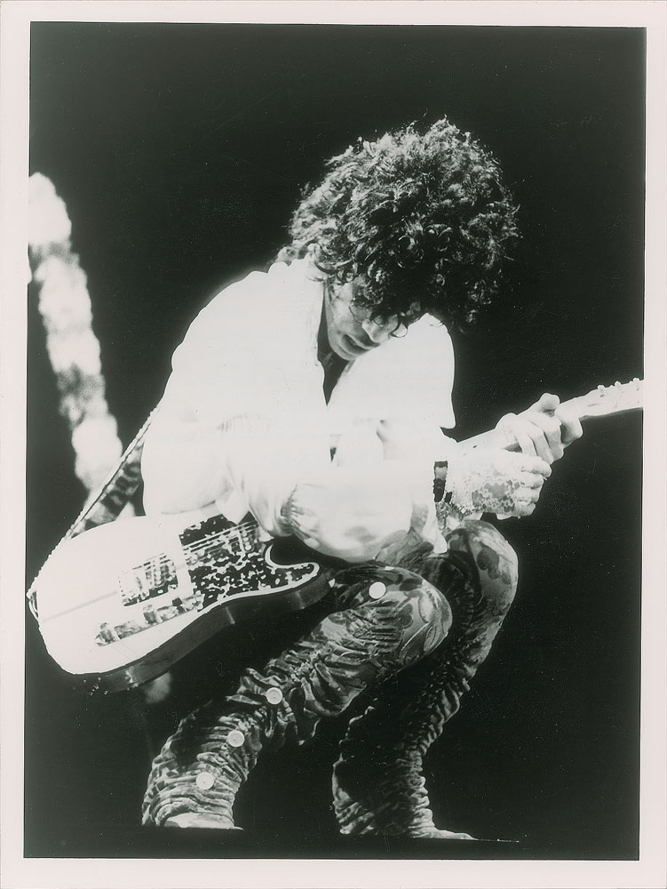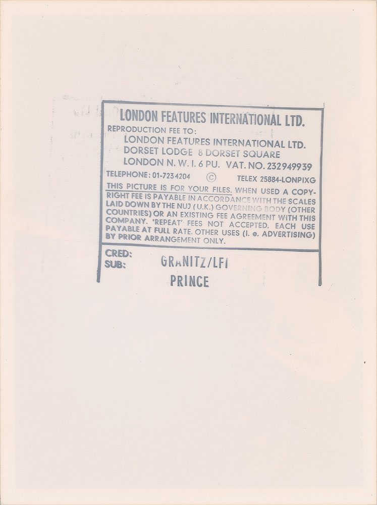 Original vintage glossy 6 x 8 silver gelatin photo of Prince crouching on stage with his Telecaster electric guitar. Reverse bears a Granitz/London Features International credit stamp. In fine condition.