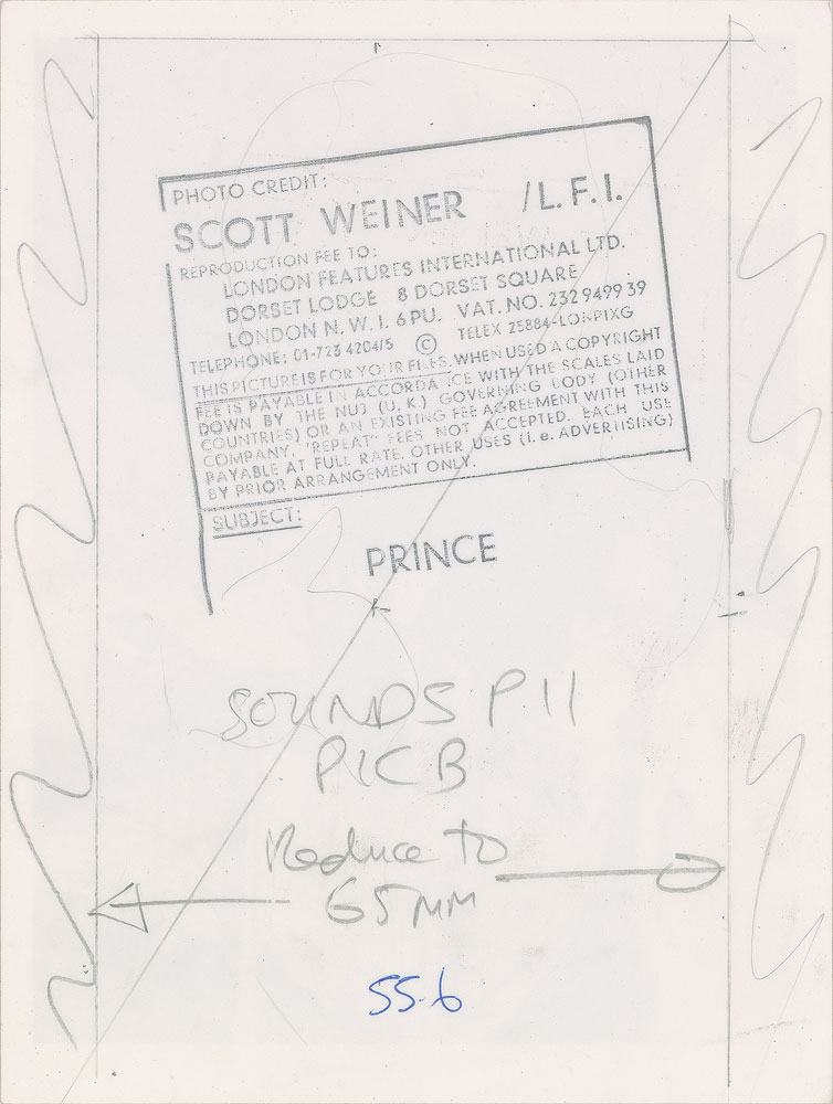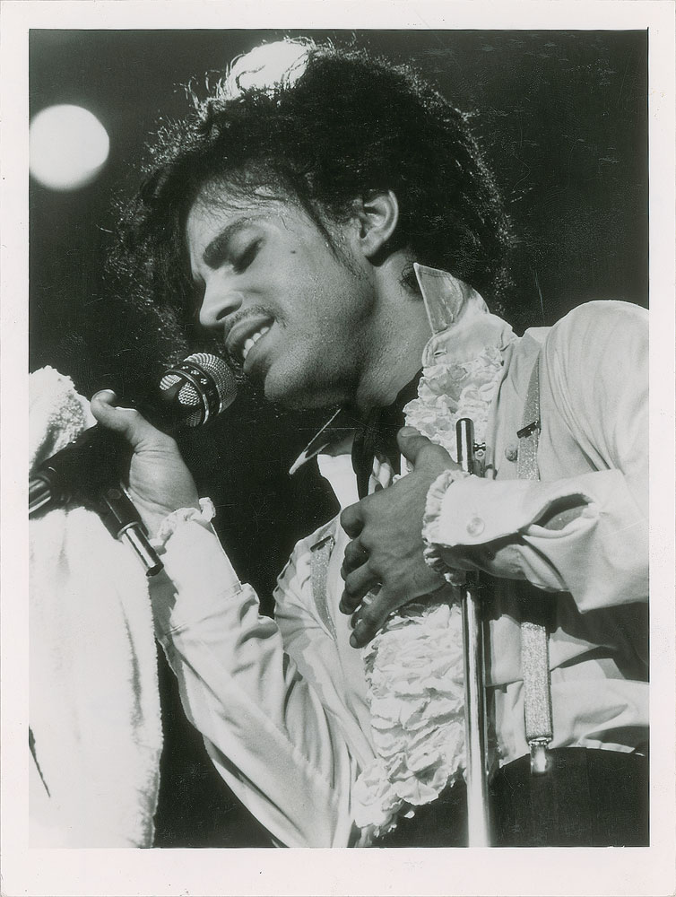 Original vintage glossy 6 x 8 silver gelatin photo of Prince singing on stage in his classic white ruffled shirt during the 1984 Purple Rain tour. Reverse bears a Scott Weiner/London Features International credit stamp. In fine condition.