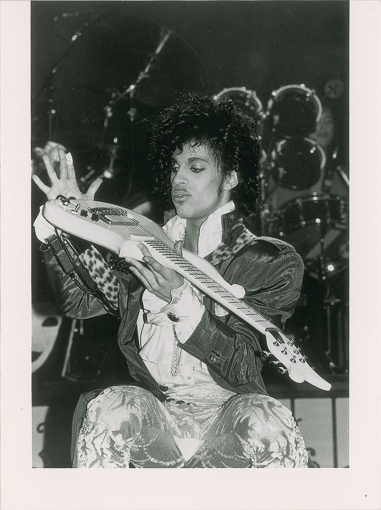 Original vintage glossy 6 x 8 silver gelatin photo of Prince sitting on stage with his white Cloud guitar during the 1984 Purple Rain tour. Reverse bears an Ebet Roberts/London Features International credit stamp. In fine condition, with a neatly trimmed top edge.