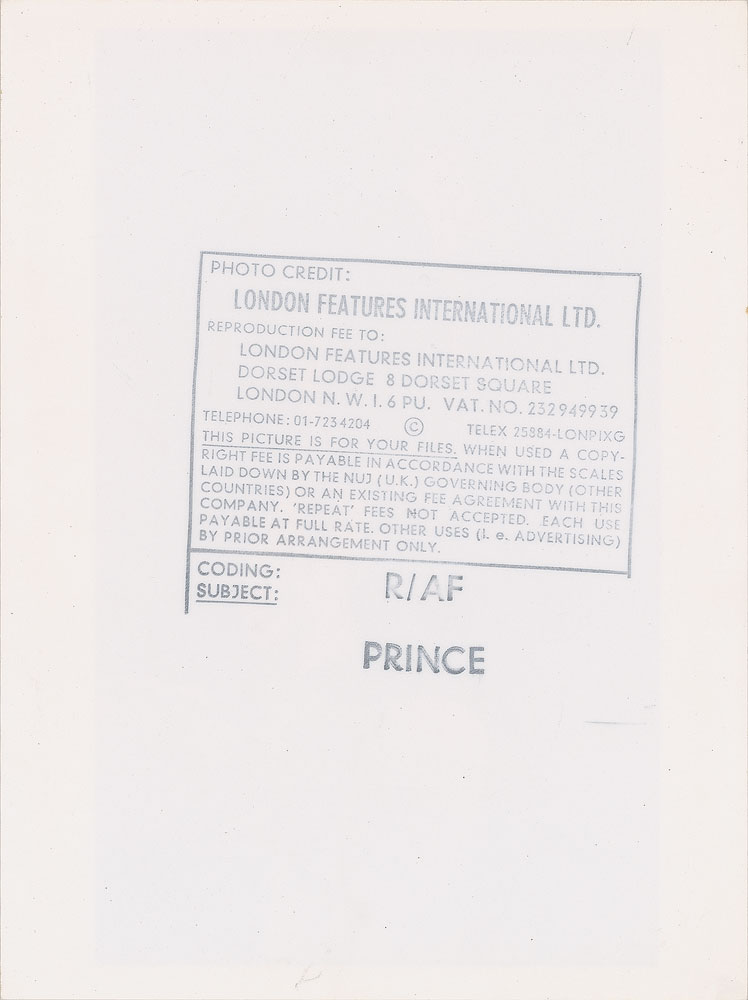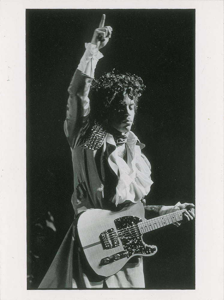 Original vintage glossy 6 x 8 silver gelatin photo of Prince pointing skyward during his 1984 Purple Rain Tour. Reverse bears a London Features International credit stamp. In fine condition.