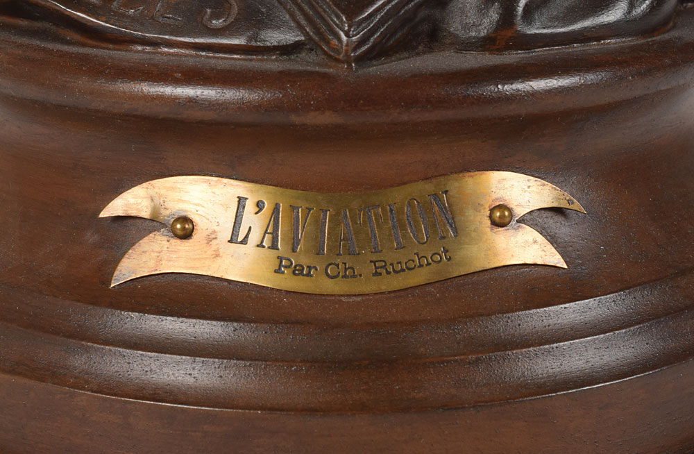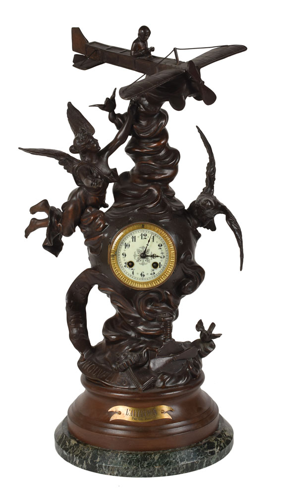 Beautiful circa 1910 hollow-cast spelter sculptural clock inspired by French aviator Louis Bleriot, measuring approximately 26.5″ tall, set upon a marble base, with a brass plaque at the bottom engraved, "L'Aviation, Par Ch. Ruchot." The sculpture portrays Bleriot in his monoplane atop a stylized cloud formation, flanked by birds and the goddess of Victory. A sash ribbon descends from the center, lettered "Sciences Nouvelles," and a book at the base is titled "Conquete de L'air." The propellors of both Bleriot's monoplane and an aero engine at the bottom are rotatable. The center features a clock with an Arabic 12-hour dial (working condition unknown). In fine condition, with a few tiny surface chips toward the bottom. A breathtaking piece commemorating the exciting early days of aviation. Please contact RR Auction for a shipping quote.