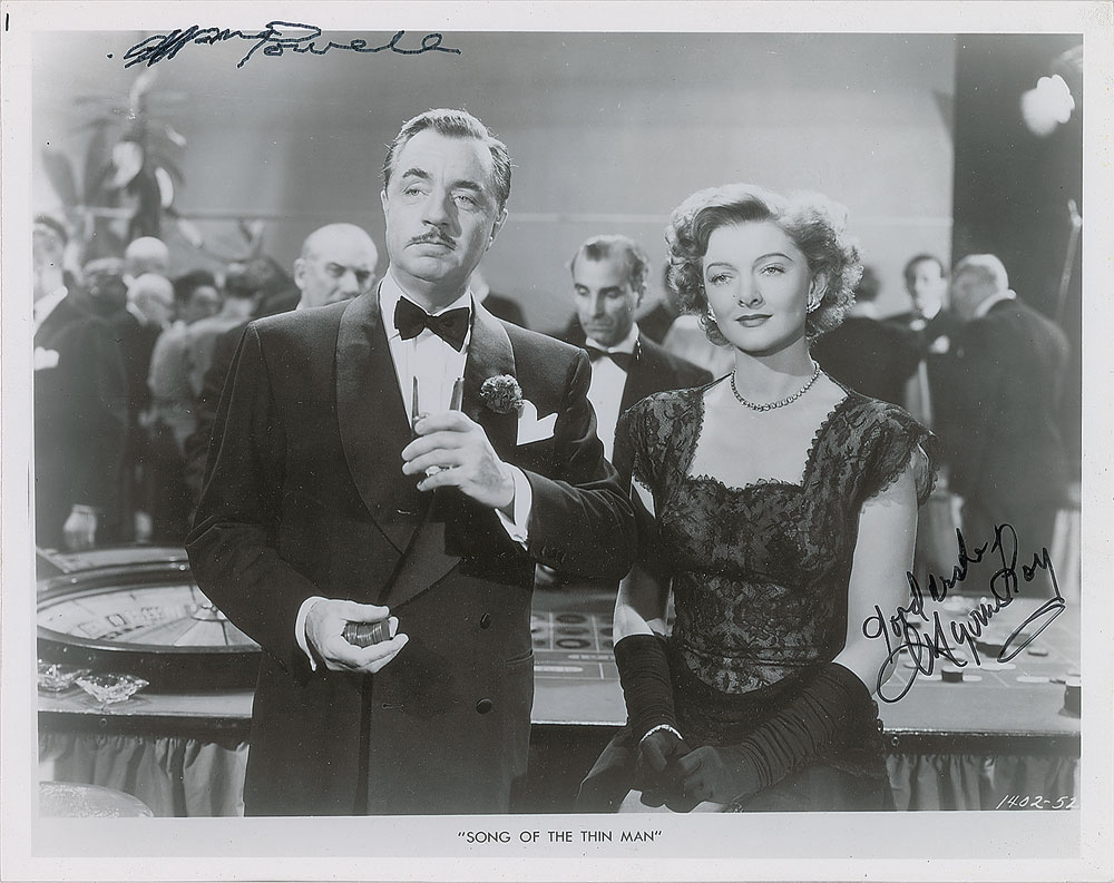 Glossy 10 x 8 photo of Nick and Nora Charles from the 1947 film Song of the Thin Man, signed in black felt tip, "Wm. Powell" and "Good wishes, Myrna Loy." In fine condition.