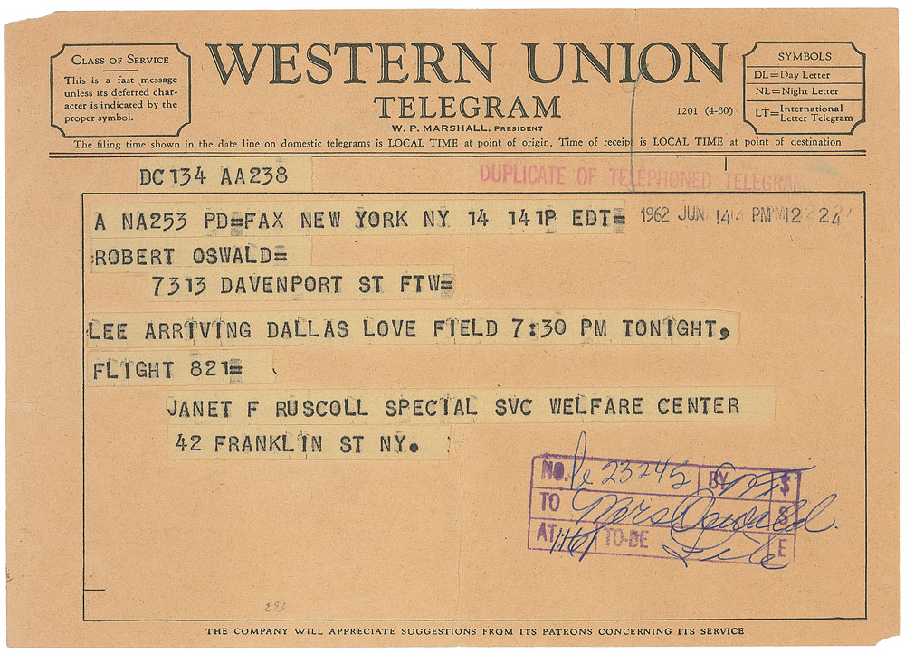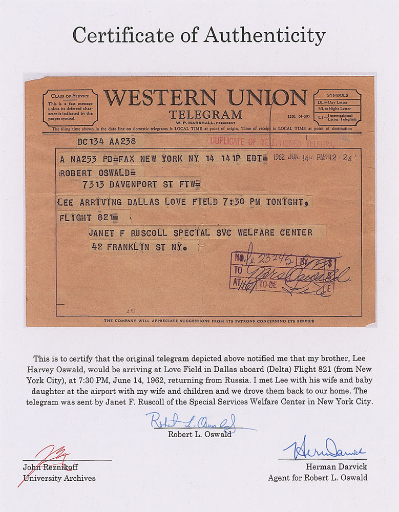 Original Western Union typed telegram sent to Robert L. Oswald to notify him of Lee Harvey Oswald’s return to the US, one page, 8 x 5.75, stamp-dated June 14, 1962. In full: “Lee arriving Dallas Love Field 7:30 PM tonight, Flight 821.” Telegram was sent by Janet F. Ruscoll of the Special Services Welfare Center in New York. In very good to fine condition, with central vertical and horizontal folds, overall creases, and a couple edge tears. Accompanied by a letter of authenticity from his older brother, Robert L. Oswald. Returning from the USSR, the Oswalds arrived in Hoboken, New Jersey, on June 13 via the ocean liner SS Maasdam, and the following day took Delta Flight 821 to Dallas. Upon his arrival at Love Field, Oswald was disappointed that they received absolutely no attention from the press—he had even prepared answers to questions he anticipated being asked at press conferences or interviews.
