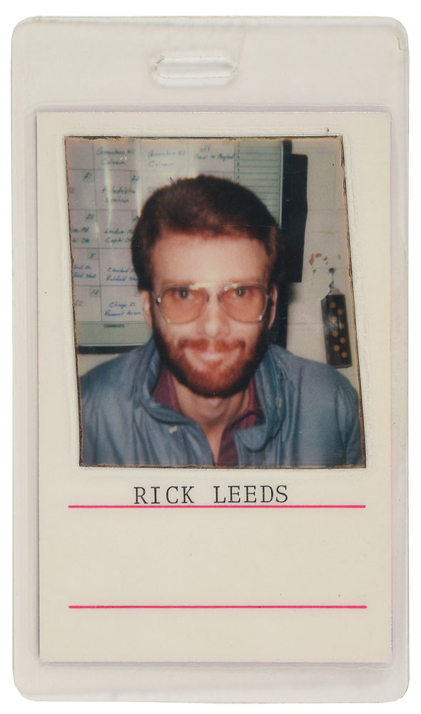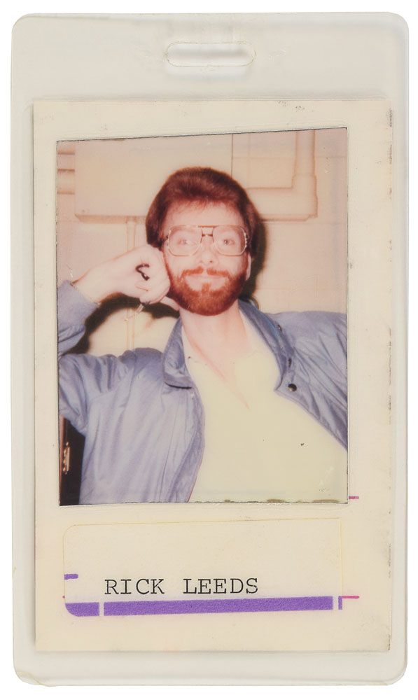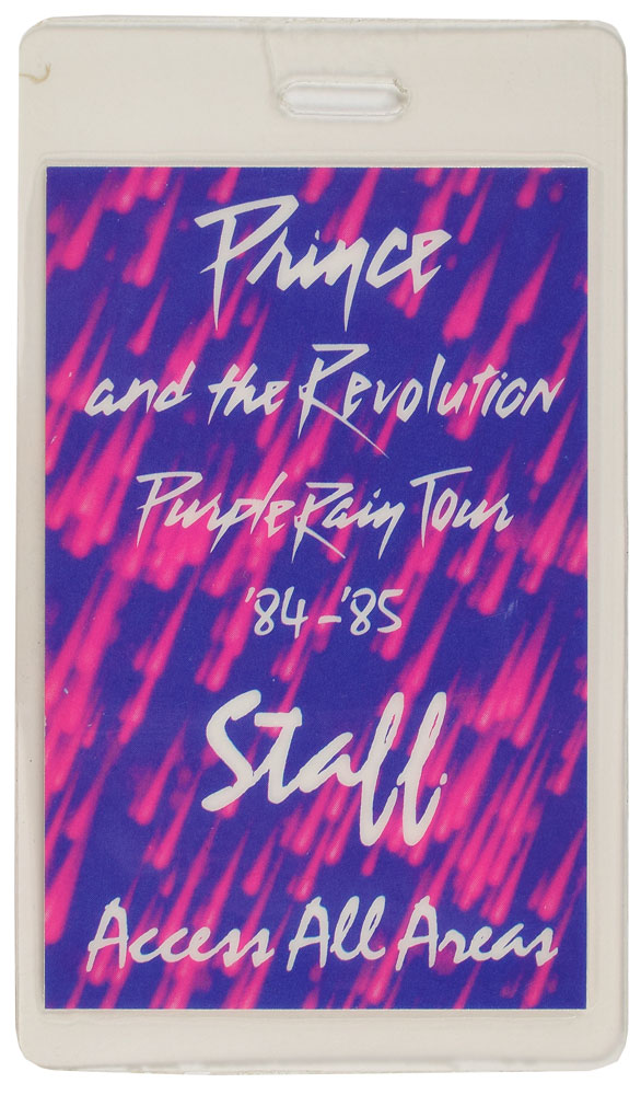 Three items from the collection of Prince's saxophonist Eric Leeds: an original bi-fold 9 x 12 program for Purple Rain; and two different versions of the all-access staff pass for the Prince and the Revolution Purple Rain Tour of 1984-85, each bearing a laminated photo of Leeds with his typed nickname below, "Rick Leeds." In overall fine condition, with some creasing to program. From the collection of musician/saxophonist Eric Leeds and accompanied by a letter of provenance.
