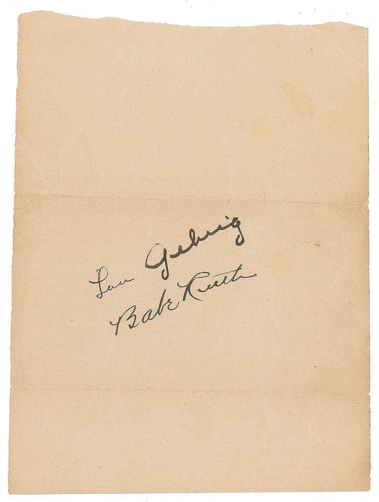 Exceptionally bold vintage circa 1927 fountain pen signatures, "Babe Ruth" and "Lou Gehrig," on an off-white 4.75 x 6.5 sheet. In very good to fine condition, with two horizontal folds and scattered creasing. Two of baseball's home run-hitting titans, Ruth and Gehrig were the centerpieces of the classic 'Murderer's Row' Yankees lineups. Rarely are their signatures found in such a perfect, displayable pairing.