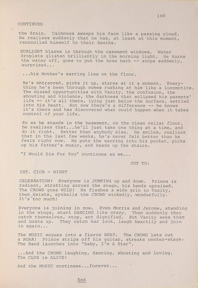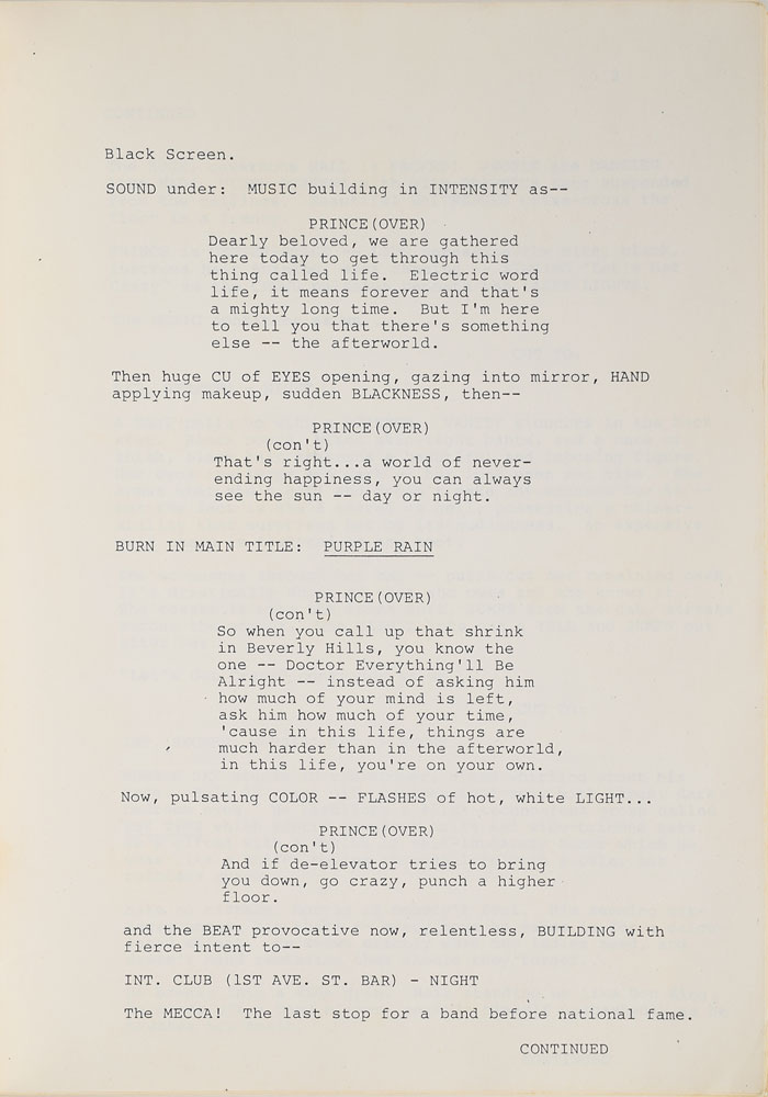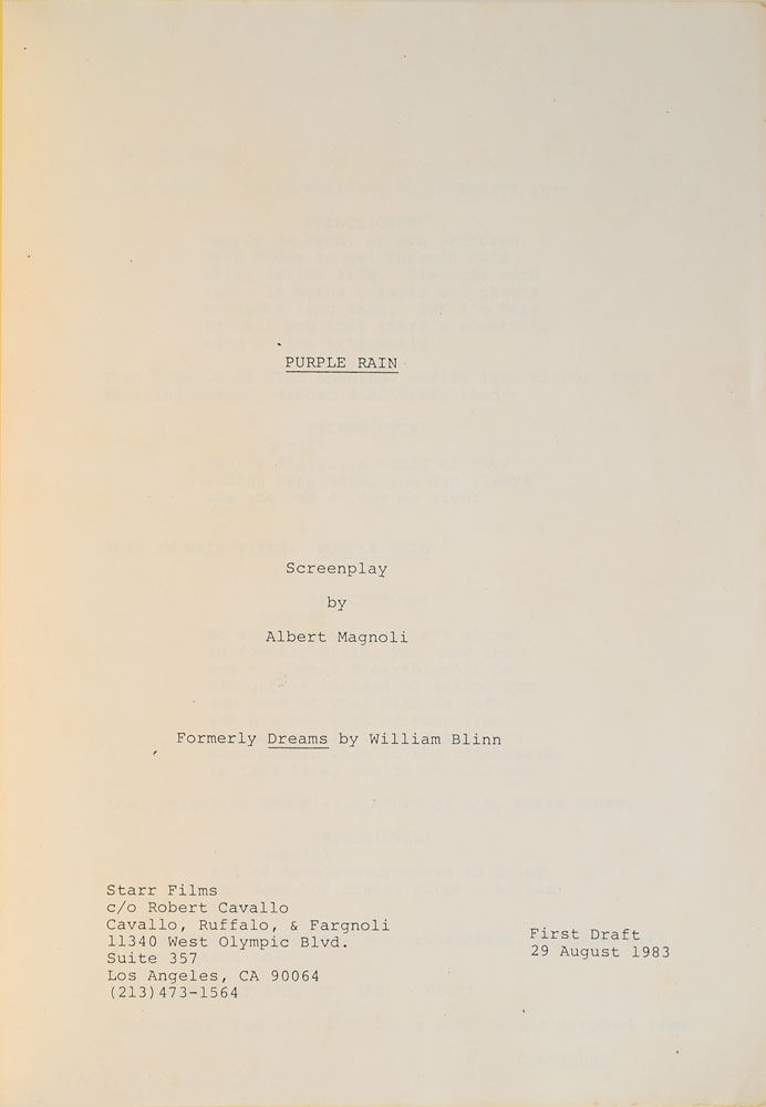 Sought-after original brad-bound first draft of the screenplay for Purple Rain, 8.5 x 11, 100 pages, with the title page reading: "Purple Rain, Screenplay by Albert Magnoli, Formerly Dreams by William Blinn, First Draft, 29 August 1983." The script begins with Prince's famous voiceover from the beginning of 'Let's Go Crazy': "Dearly beloved, we are gathered here today to get through this thing called life. Electric word life, it means forever and that's a mighty long time. But I'm here to tell you that there's something else—the afterworld." This first draft of the script casts Vanity, rather than Apollonia, as Prince's love interest in the classic film. In fine condition, with some mild wear to cover. From the collection of an early Prince insider.