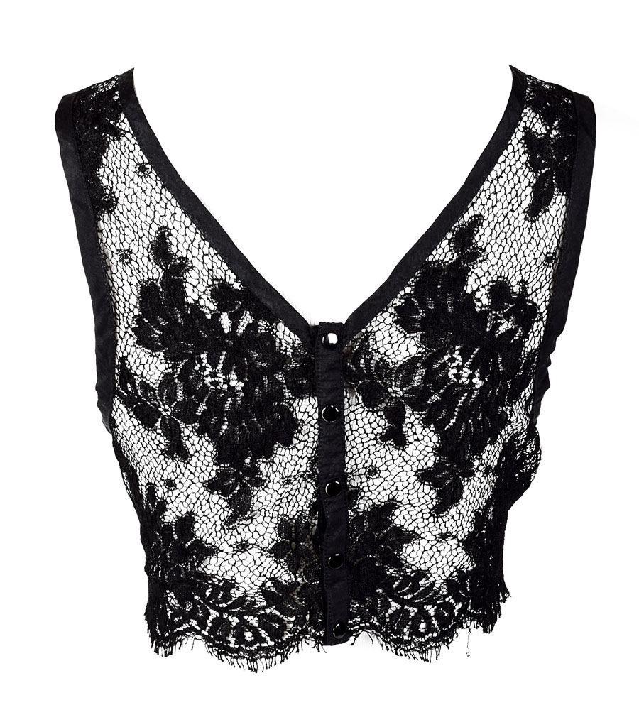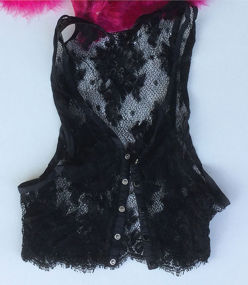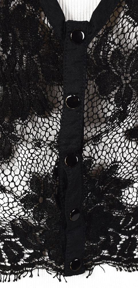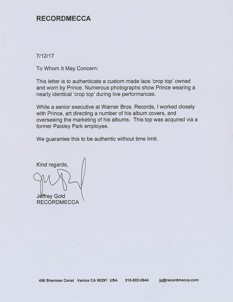 Prince's personally-owned and -worn black lace crop top vest with five snap buttons on the front, constructed of a thin black lace with floral designs. In fine condition. Prince regularly wore this type of lace vest from the mid-1980s through the early 90s, and is seen in numerous photos wearing nearly identical vests of the same cut and construction, but with the lace pattern appearing slightly different. Includes a letter of authenticity from Jeff Gold, the owner of Recordmecca and a former executive vice president/general manager of Warner Bros. Records, who worked closely with Prince during the 1990s, and art directed numerous album covers for him, including ‘Diamonds & Pearls,’ ’Love Symbol,’ and ‘The Hits/The B-Sides.’ He writes, in part: "This letter is to authenticate a custom made lace 'crop top' owned and worn by Prince. Numerous photographs show Prince wearing a nearly identical 'crop top' during live performances...This top was acquired via a former Paisley Park employee." A prime example of Prince's unique fashion sense.