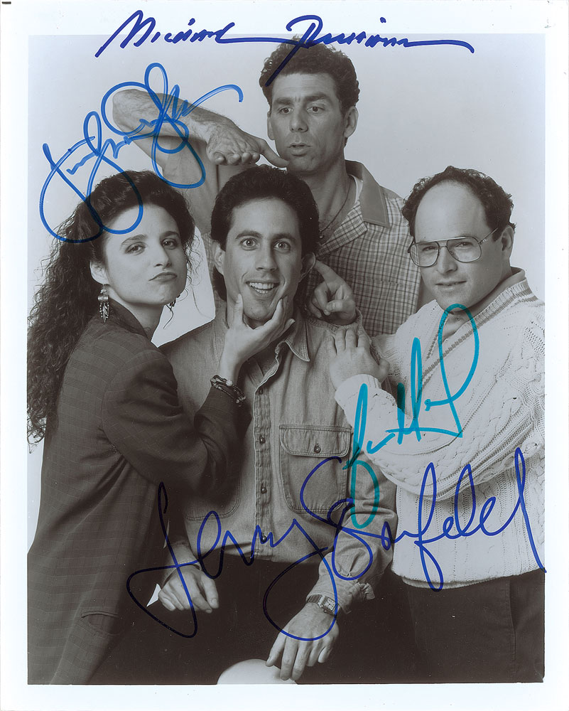 Glossy 8 x 10 photo of the Seinfeld cast, signed in blue felt tip by Jerry Seinfeld, Jason Alexander, Julia Louis-Dreyfus, and Michael Richards. In fine condition.