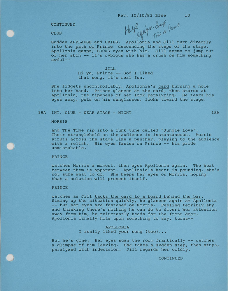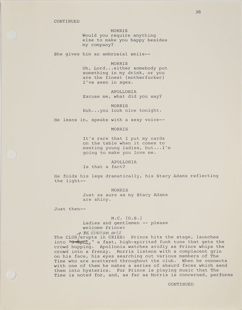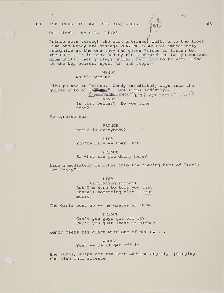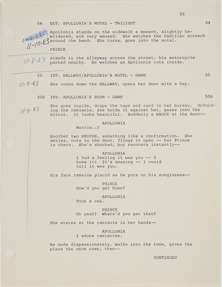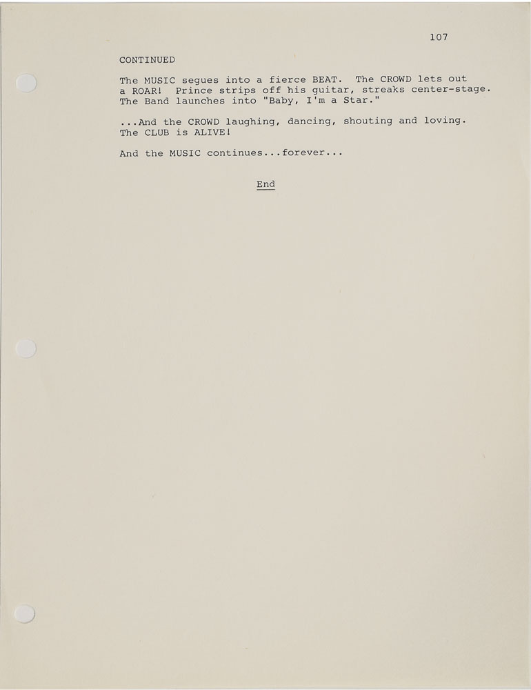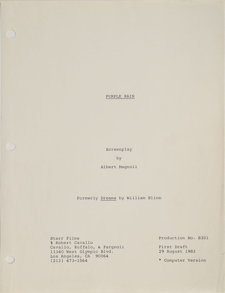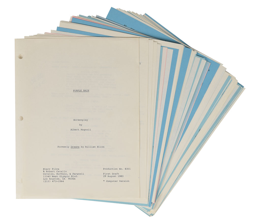 Complete original disbound copy of the script for Purple Rain belonging to tour manager Alan Leeds, 8.5 x 11, 107 pages, with the title page, reading: "Purple Rain, Screenplay by Albert Magnoli, Formerly Dreams by William Blinn, Production No. 8301, First Draft, 29 August 1983, * Computer Version." Although the title page denotes this as a "First Draft," it seems to be a later version, as Apollonia is cast as Prince's love interest (in the true first draft, it was Vanity). The script also has blue and pink revision pages inserted throughout. Many pages are annotated with information including the dates or locations where scenes were shot, or small changes made to the script. Also includes twelve pages referred to as 'Q' pages, code for an alternate ending, with the cover sheet reading, "Second Ending, 'Q' Pages - 'Q' Scenes, 10/14/83," and a six-page "Crew List" with names and contact information for the crew. In fine condition. From the collection of Prince's assistant tour manager Gwen Leeds and accompanied by a letter of provenance. A fantastic piece from the production of Prince's classic film.