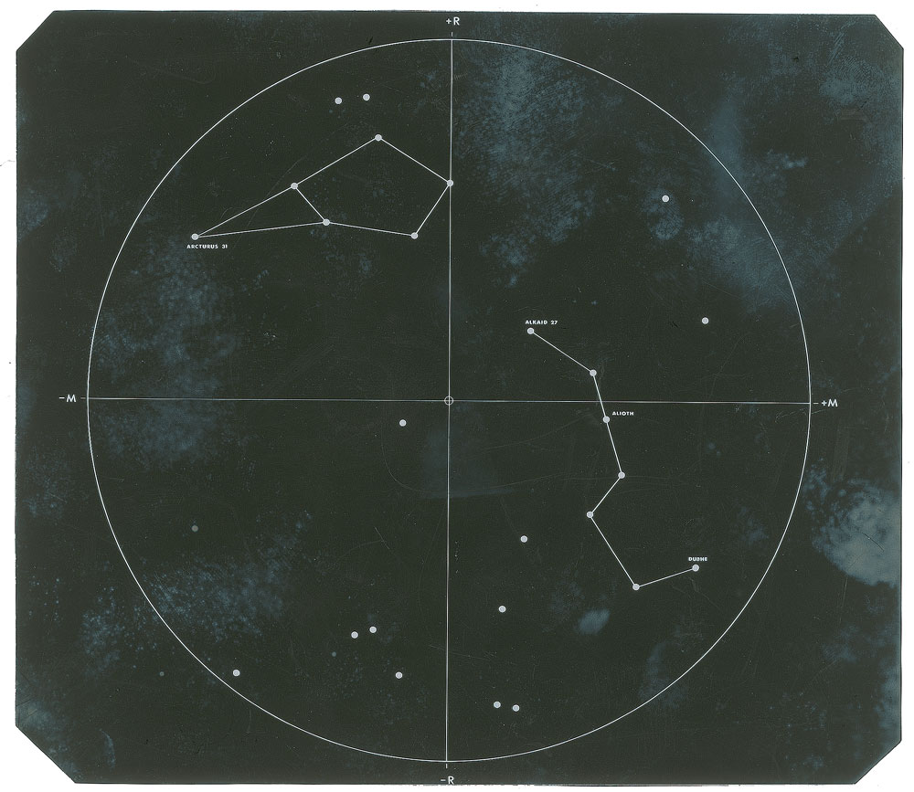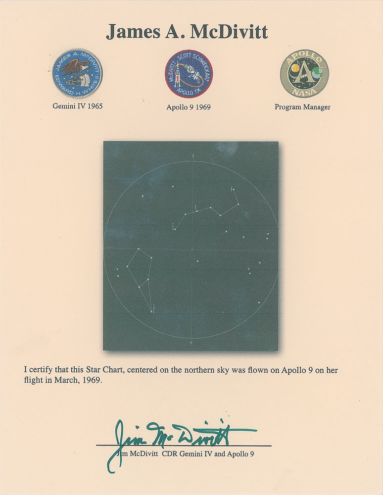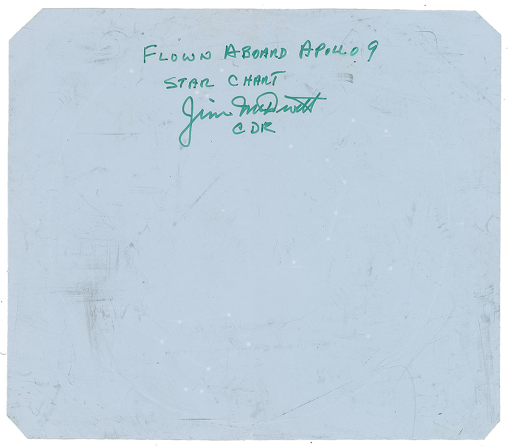 Flown star chart carried on the Apollo 9 mission, 7 x 6, signed and flight-certified on the reverse in green felt tip, "Flown aboard Apollo 9, Star Chart, Jim McDivitt, CDR." The chart is made of a plastic film (chronopaque) and centered on the northern sky, and was used in conjunction with the scanning telescope for navigation. In fine condition. Accompanied by a letter of authenticity signed by McDivitt, as well as a photo of him holding the chart. A fantastic flight-flown piece certified by the commander of Apollo 9, the first flight of the CSM with the LM.