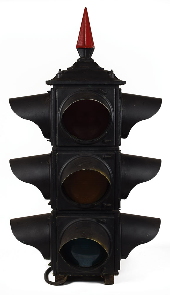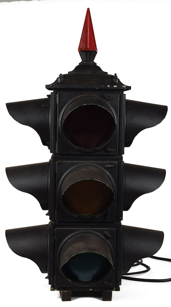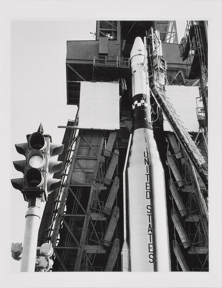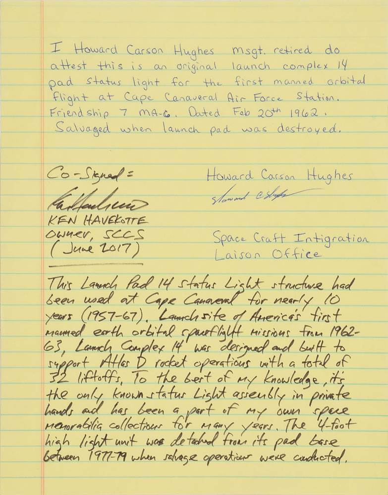 Enormous stoplight-style pad status light structure from Cape Canaveral Air Force Station Launch Complex 14, measuring approximately 28 x 46 x 28, used for ten years from 1957-1967, including for the MA-6 flight of Friendship 7 in which John Glenn became the first American to orbit Earth. Includes its associated switch box. In very good to fine condition. Accompanied by a letter of provenance from a member of the Spacecraft Integration Liaison Office, in part: "This is an original launch complex 14 pad status light for the first manned orbital flight at Cape Canaveral Air Force Station, Friendship 7 MA-6...Salvaged when the launch pad was destroyed." The letter has been additionally certified by aerospace memorabilia specialist Ken Havekotte, in full: "This Launch Pad 14 status light structure had been used at Cape Canaveral for nearly 10 years (1957-67). Launch site of America's first manned earth orbital spaceflight missions from 1962-63, Launch Complex 14 was designed and built to support Atlas D rocket operations with a total of 32 liftoffs. To the best of my knowledge, it's the only known status light assembly in private hands and has been a part of my own space memorabilia collections for many years. The 4-foot high light unit was detached from its pad base between 1977-79 when salvage operations were conducted." Also includes multiple photos showing the light in place at Pad 14. An absolutely impressive piece boasting fabulous, photo-identified provenance. Due to the size and/or weight of this item, this piece will need to be crated and shipped by a third party freight company. Please contact shipping@rrauction for additional information.