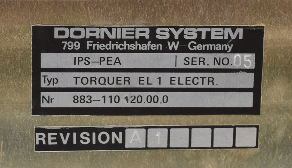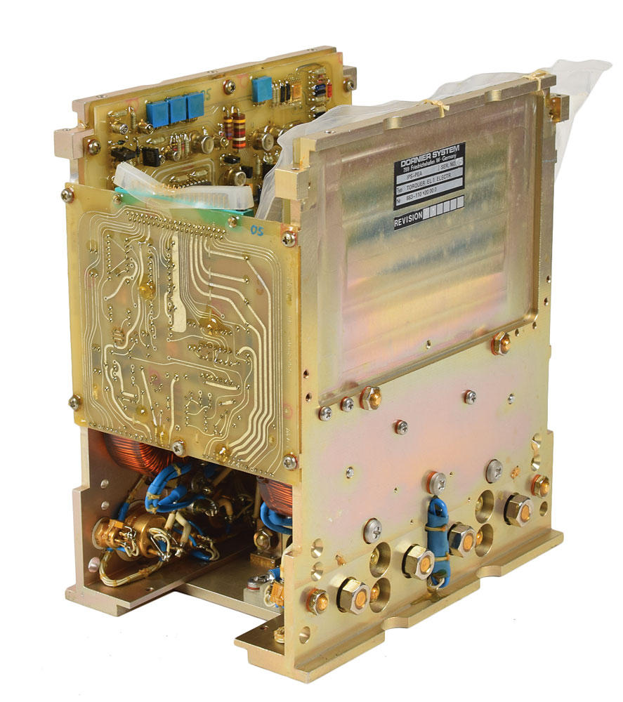 A fully intact IPS (Instrument Pointing System) and PEA (Payload Electronics Assembly) possibly flown-used on a Shuttle OV Spacelab module during the 1980s, measuring 9 x 9 x 5.5, bearing a Dornier System tag on one side, reading: "IPS-PEA, Ser. No. 05, Typ Torquer EL 1 Electr., Nr 883-110120.00.0, Revision A1." In fine condition. From the collection of aerospace memorabilia specialist Ken Havekotte. Flown status presumed by Havekotte. Located in the Orbiter's payload bay area, this was a critical piece of the 3-axis gimbal system that provided precision pointing of a wide range of payloads. Some research to be accomplished on Spacelab missions required that instruments be pointed with very high accuracy and stability at stars, the sun, the Earth, or other targets of observation, which was made possible by the IPS.