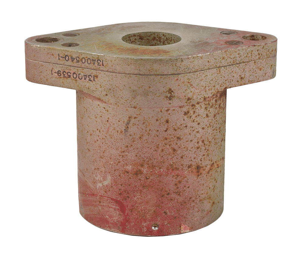 Used Space Shuttle Solid Rocket Booster (SRB) separation nut from Launch Complex 39, measuring approximately 5.5 x 3.25 x 4, marked on the side: "Part Name: Separation Nut, MSFC Part No. 10309-0001-101, Manufacturer Lot No AAA, Serial Number 00055, Assembly Date Mo 6 Yr 79." In very good condition, with wear and rusting. From the collection of aerospace memorabilia specialist Ken Havekotte. A very early piece from the Shuttle program.