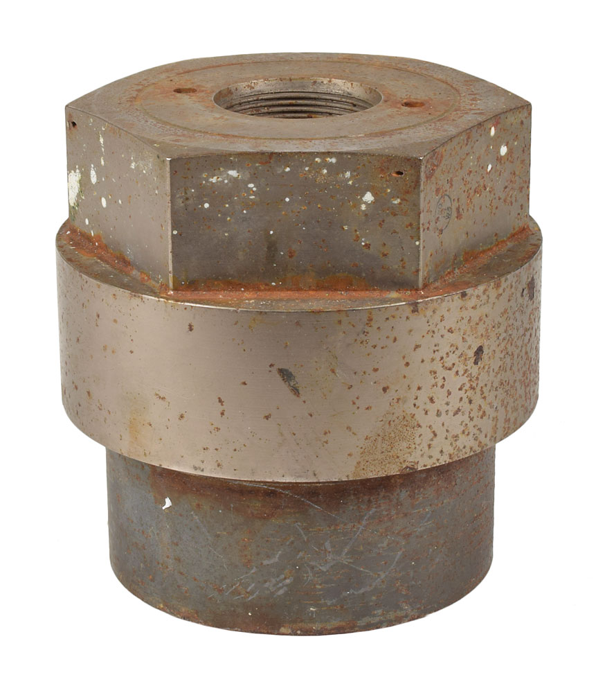 Used Space Shuttle Solid Rocket Booster (SRB) aft separation bolt from Launch Complex 39, measuring 5.5″ in diameter and 6″ tall, likely dating to the early 1980s. Remnants of a label remain affixed to the side. In spite of its relatively small size, this piece weighs nearly 32 pounds. In very good condition, with overall wear and rusting. From the collection of aerospace memorabilia specialist Ken Havekotte.