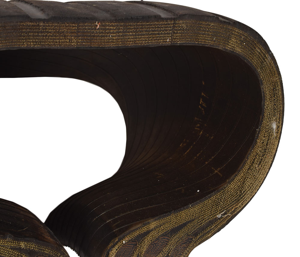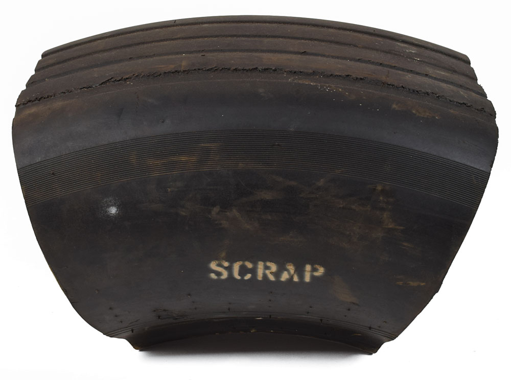 A large flown-used segment of Shuttle Orbiter main gear tire from an unknown mission, measuring approximately 14 x 10 x 16, marked "Scrap" on two sides. In very good condition, with expected wear from use. From the collection of aerospace memorabilia specialist Ken Havekotte. Flown status presumed by Havekotte.
