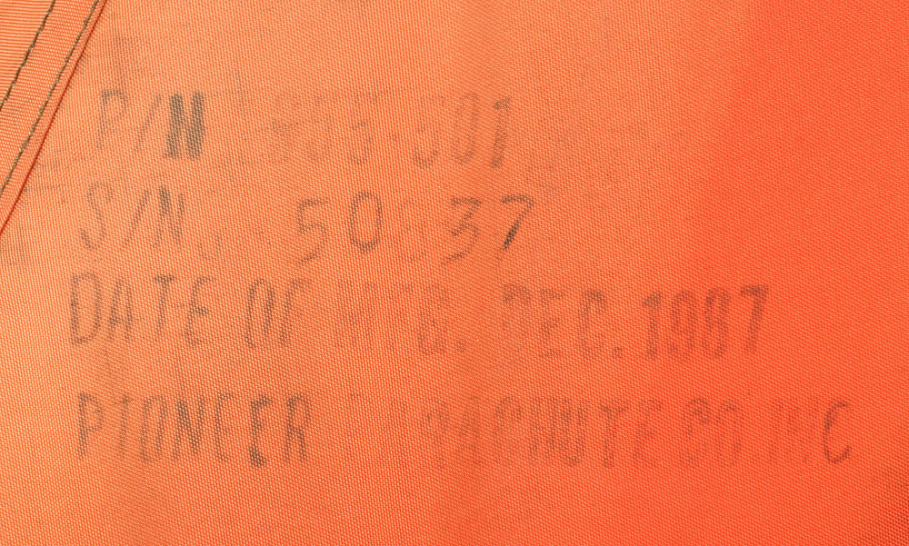 Retrieval floatation support device designed to recover a Space Shuttle Solid Rocket Booster (SRB). The large bright orange float approximately measures 43 x 23.5 x 14.5, features a cluster of ten straps cinched together to form a small loop, numerous reflective pads to each side and bottom, with part numbers stamped to a left panel: "PN 955-501, S/N 50837, Date of Mfg. Dec. 1987, Pioneer Parachute Co., Inc." In very good condition, with expected wear from use. From the collection of aerospace memorabilia specialist Ken Havekotte.