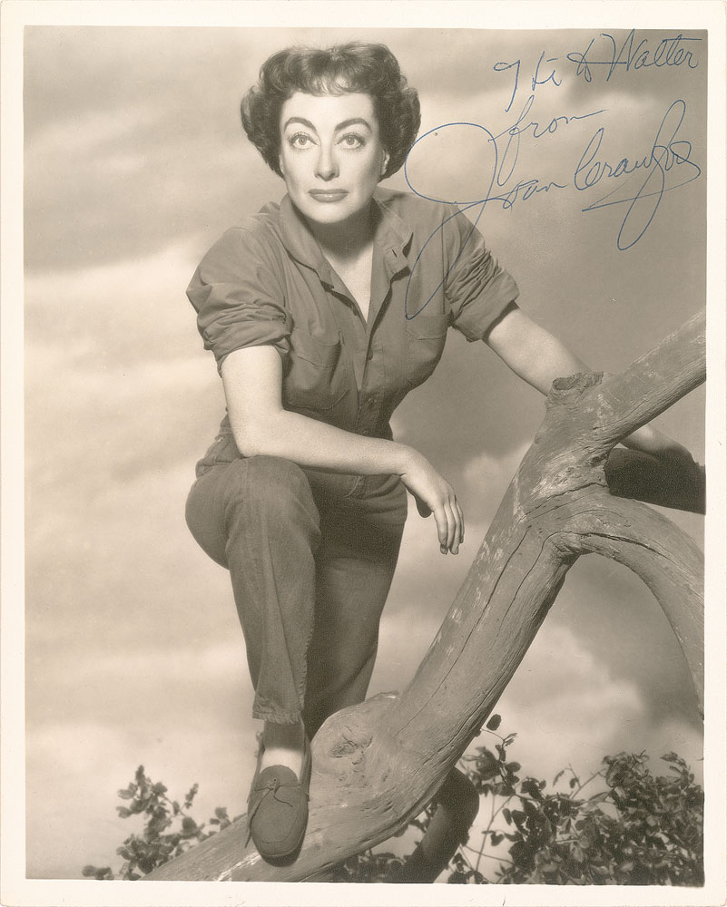 Three matte-finish photos signed by Joan Crawford, including: an 8 x 10 studio portrait by Bert Six, signed and inscribed in blue ballpoint, "Hello to June and Roy, from, Joan Crawford,” with the reverse bearing a Warner Bros. photography stamp; and two photos of Crawford as Vienna in the 1954 film Johnny Guitar, both approximately 8 x 10, both signed and inscribed in ballpoint, "Hi to Walter, from, Joan Crawford” and “To Ambrose, from Joan Crawford.” In overall fine condition.