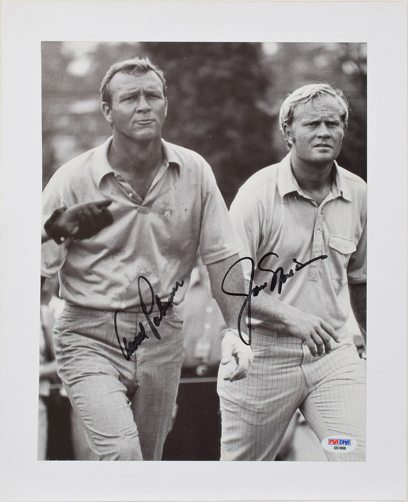 Appealing semi-glossy 9 x 11.5 photo of Arnold Palmer and Jack Nicklaus walking together at the 1972 Masters Tournament, with both signing in black felt tip. Photo is affixed to a slightly larger cardstock mount. In fine condition. Accompanied by a full letter of authenticity from PSA/DNA.