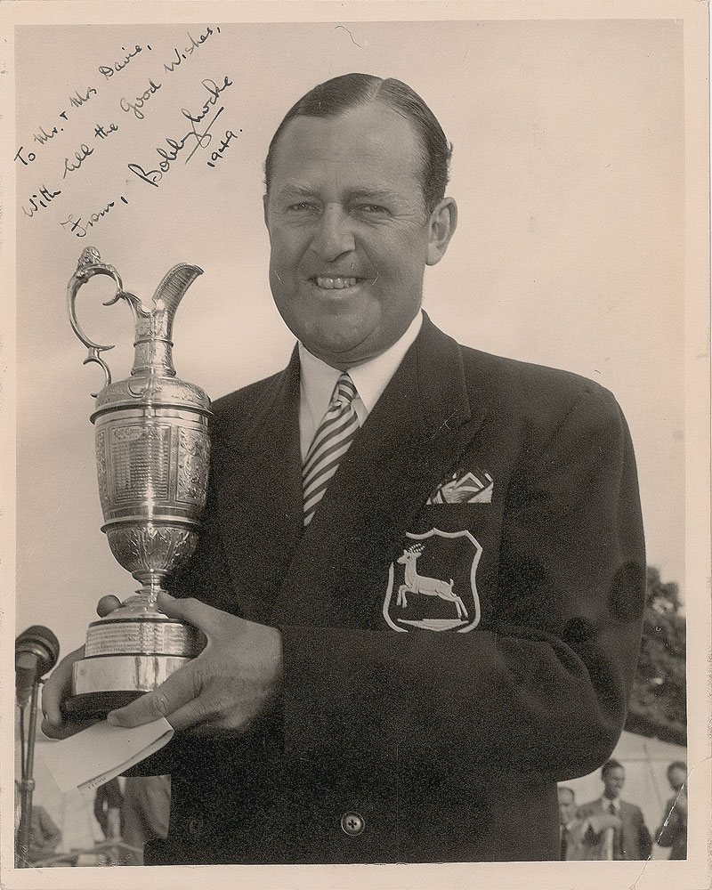 South African professional golfer (1917-1987) who won four Open Championships, nine South African Opens, seven South African PGA Championships, and 15 PGA Tour events. Vintage matte-finish 8 x 10 photo of Locke proudly holding the Claret Jug of the British Open, signed and inscribed in fountain pen, "To Mr. & Mrs. Davie, With all the good wishes, from, Bobby Locke, 1949.” In very good to fine condition, with scattered light creasing, and a heavier crease to the lower right corner. Locke won the Open Championship four times: 1949, 1950, 1952, and 1957.