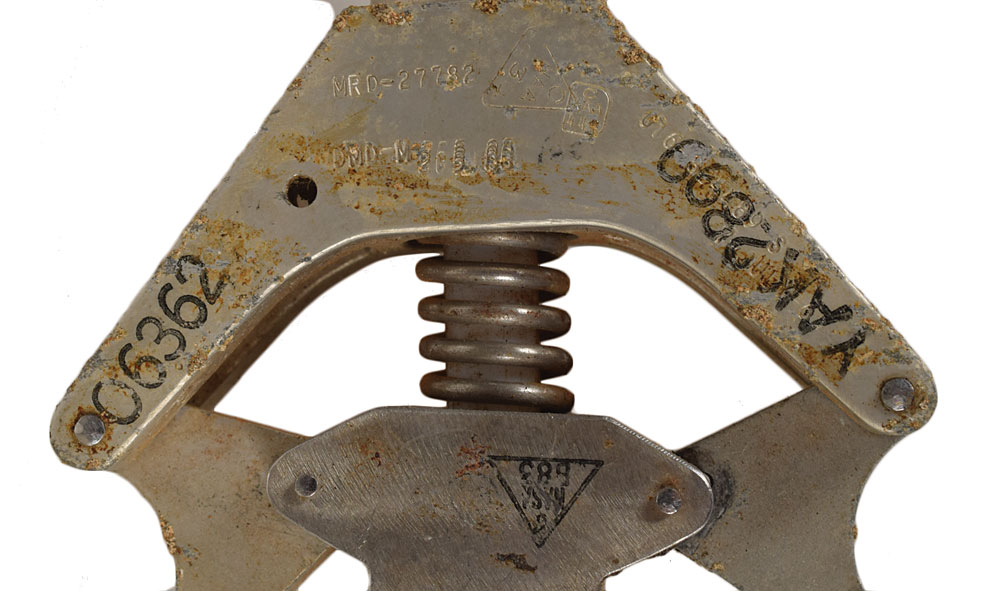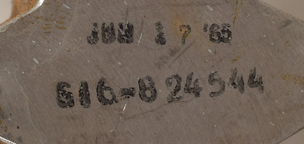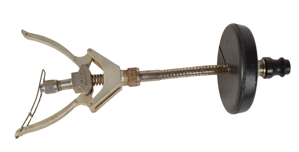 R-4D Reaction Control Engine purge plug, measuring 15″ long, with the metal parts bearing stamped and stenciled part numbers, and a hard rubber collar at the bottom of the flexible base labeled "Durometer 60/70." The R-4D and this type of purge plug were use on the Apollo Service Module and the Lunar Module. In fine condition, with scattered light wear.