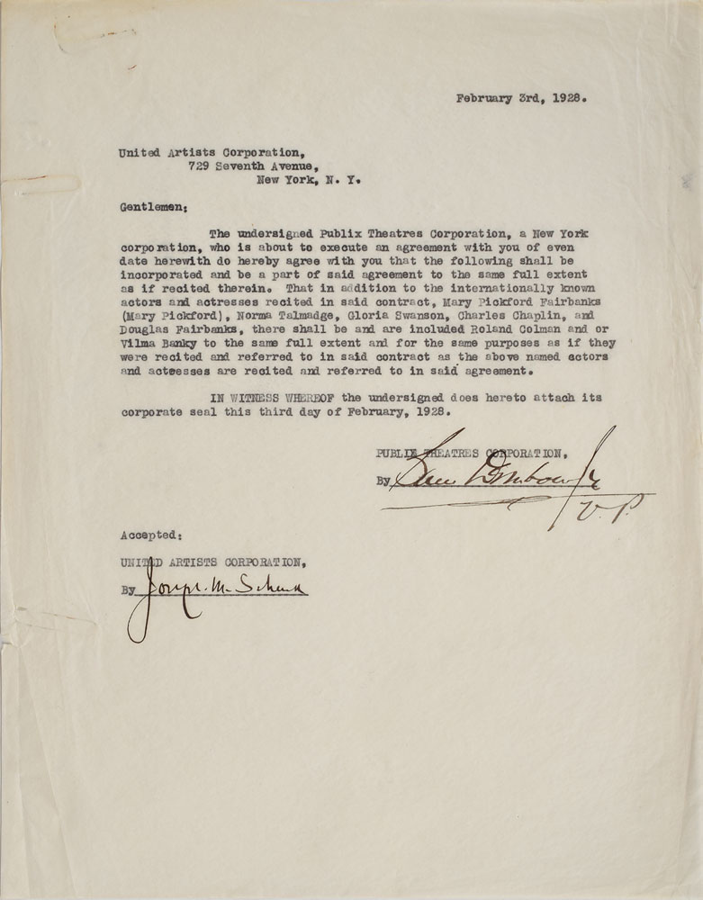 Two documents: a DS signed "Joseph M. Schenk," an American film studio executive who co-created Twentieth Century Pictures, one page, 8.5 x 11, February 3, 1926, relating to the addition of "Roland Colman and or Vilma Banky" to an existing contract between United Artists and Publix Theatres; and a DS signed "Alexander Korda," an influential British film producer through the 1930s to the 1950s, one page, 8 x 10.25, July 11, 1949, a notice from London Film Productions relaying material related to the film The Elusive Pimpernel. In overall fine condition, with expected document wear.