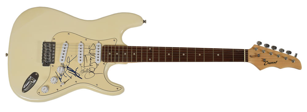 Cream-colored Crescent electric guitar, signed on the off-white pickguard in black felt tip by Paul Kantner, Jack Casady, Marty Balin, and Jorma Kaukonen. In fine condition.