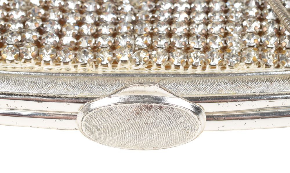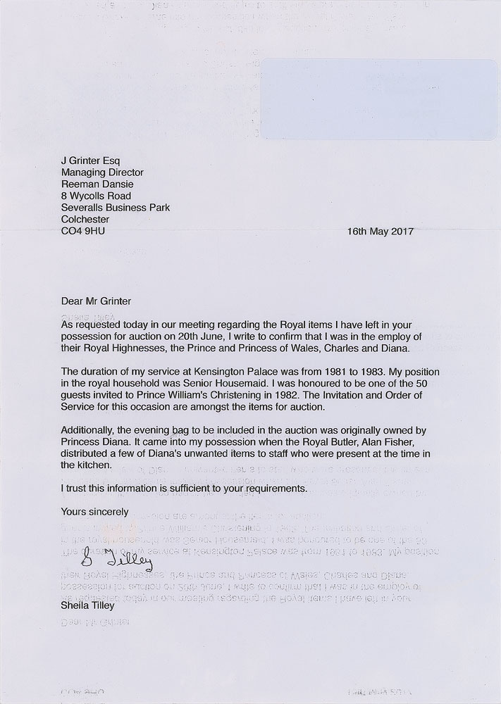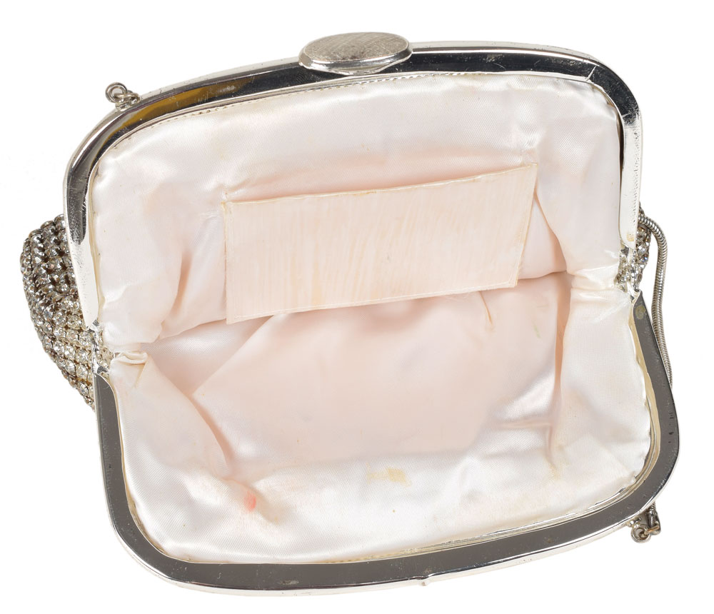 Princess Diana's extraordinary circa early 1980s personally-owned and -used satin-lined silver jeweled evening bag, measuring 8 x 6.5 x 1.5, given to Kensington Palace Senior Housemaid Sheila Tilley. In fine condition, with a few stains to interior. Accompanied by a letter of provenance from Tilley, in part: "I write to confirm that I was in the employ of their Royal Highnesses, the Prince and Princess of Wales, Charles and Diana. The duration of my service at Kensington Palace was from 1981 to 1983. My position in the royal household was Senior Housemaid. I was honoured to be one of the 40 guests invited to Prince William's Christening in 1982…The evening bag…was originally owned by Princess Diana. It came into my possession when the Royal Butler, Alan Fisher, distributed a few of Diana's unwanted items to staff who were present at the time in the kitchen." The gorgeous bag is heavy and solid, and no picture can behold its beauty. An exquisite item demonstrating Diana's fabulous style and refined taste.