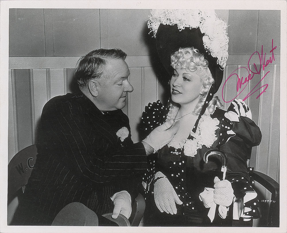 Glossy 10 x 8 photo of Mae West and W. C. Fields during production of the 1940 film My Little Chickadee, signed in red felt tip by West. In fine condition.