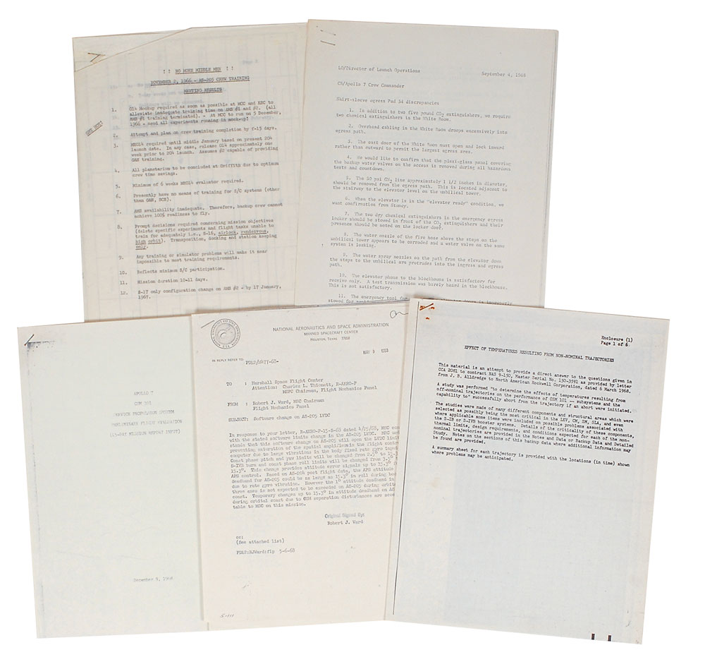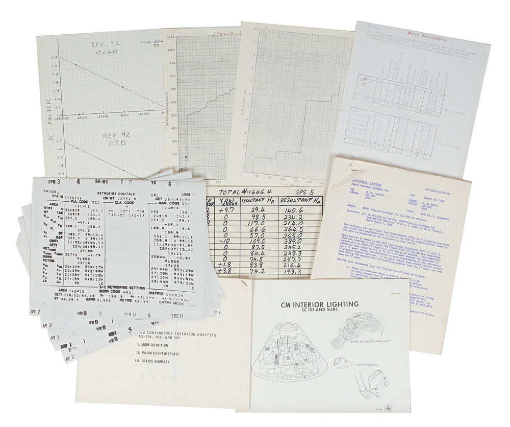 Interesting archive of Apollo documents, including: a packet entitled “Preflight and Postflight Medical Requirements, Apollo Mission C,” May 23, 1968, initialed and annotated at the bottom by Schirra, “Insufficient data—cannot compute! WMSJ, What pulse on ergometer?—etc., How much blood—why risk a collapsed artery?” An attached routing slip stamp-dated May 24, 1968, is initialed by Deke Slayton, “DK,” who writes below, “Al—this is the proposed medical pre & post flt. protocol for ‘C.’ Whatever we agree on here should be used…Please review w. Wally.” Also includes a business check, 8.5 x 3.5, filled out and signed by Schirra, “Walter W. Schirra,” dated May 10, 1983; a few charts; a packet entitled “CM Interior Lighting,” “Mission Abort and Contingency Insertion Analysis”; a thick packet labeled “MSFN Station Coverage for the CSM 101 Mission; and some additional internal memos and information regarding Apollo 7. In overall fine condition. Accompanied by a full letter of authenticity from Zarelli Space Authentication. A desirable collection of Apollo-related documents, highlighted by the first, pairing Schirra and Slayton.