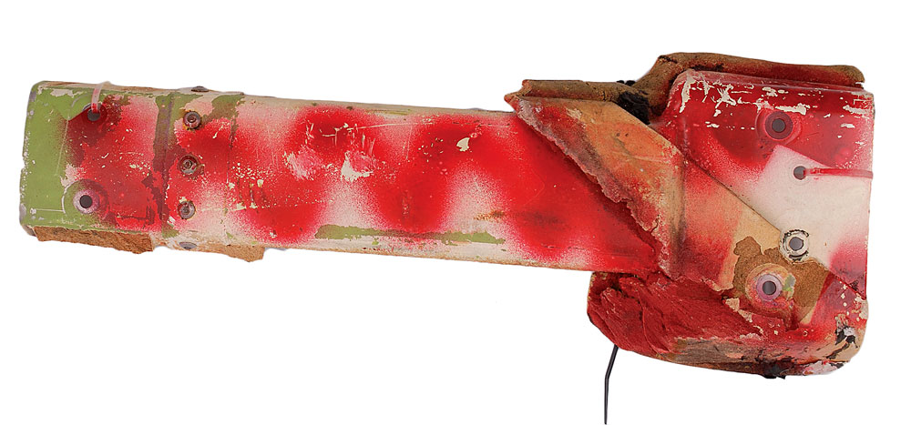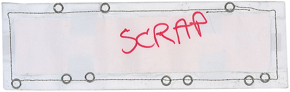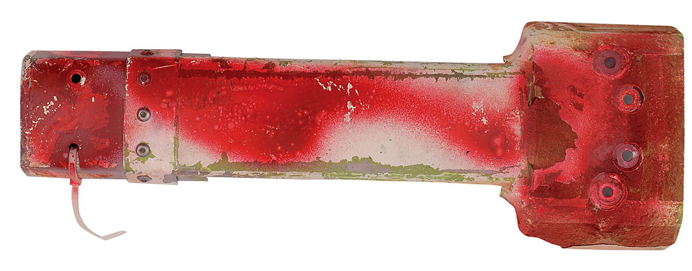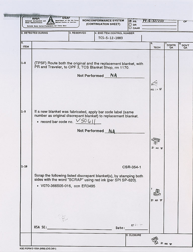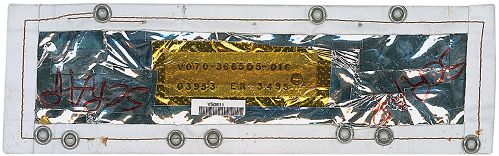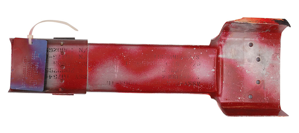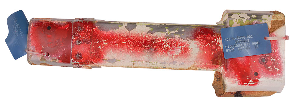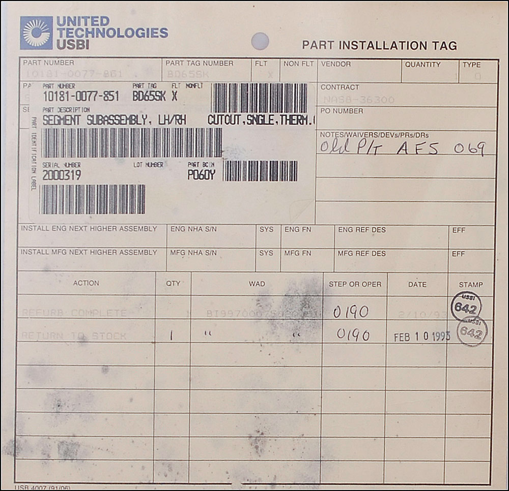 Available to US bidders only. Two items: a Shuttle TCS payload bay blanket, most likely flown, #V070-366505-016, measures 11 x 3.5, and is labeled “Scrap” on both sides in a technician’s hand; and four sections of flown System Tunnel, each measuring approximately 18.5″ long with various serial numbers printed on inside. Each tunnel portion retains original paint and NASA tags, with one tag cracked. Includes a United Technologies Part Installation Tag, describing the part as “Segment Subassembly, LH/RH, Cutout, Sngle, Therm.” In overall very good to fine condition, with expected wear from use. Blanket is accompanied by a copy of a NASA Nonconformance System report noting the scraping of the part as well as a red tag. The SRB systems tunnel, located at the 90° position of each SRB, houses the electrical cables associated with the E&I subsystem and the LSC of the Range Safety System (RSS). The tunnel provides lightning, thermal, and aerodynamic protection and mechanical support for the cables and the LSC.