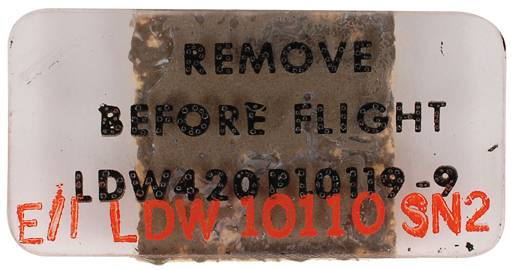 Small clear plastic LM protective cover with a Velcro swatch affixed to the reverse, 2 x 1, bearing black text reading, “Remove Before Flight, LDW420P10119-9,” and red text, “E/I LDW 10110SN2.” In fine condition.