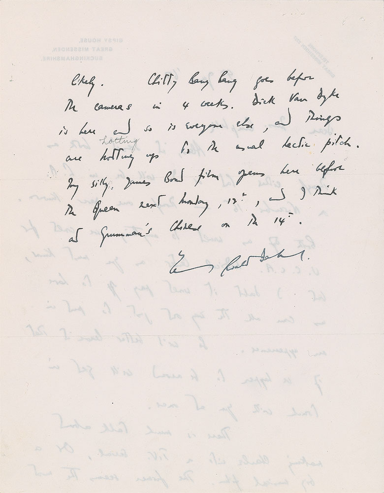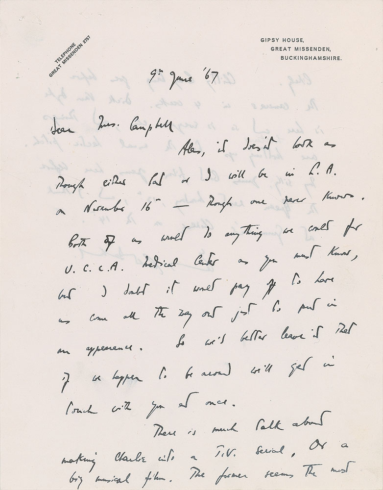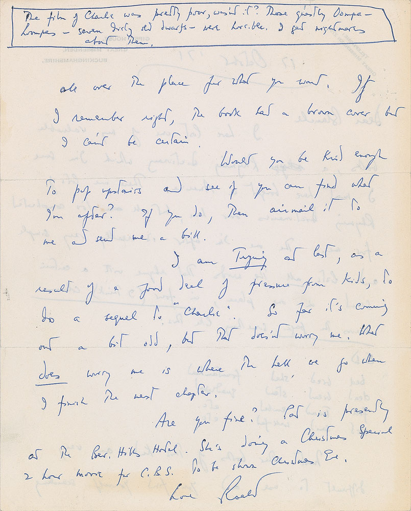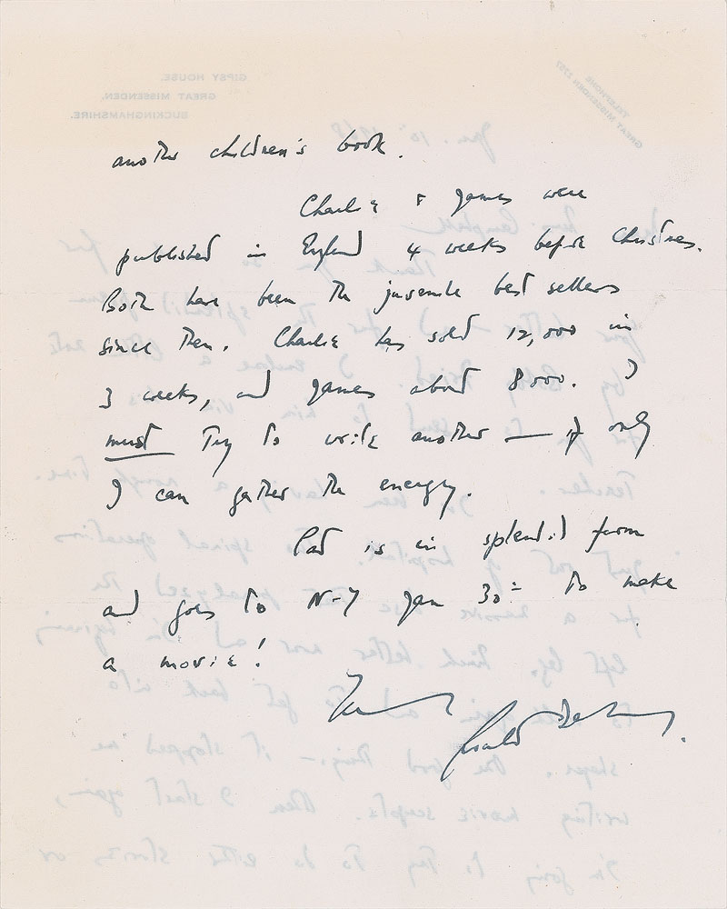 Phenomenal grouping of three ALSs signed “Roald” or “Roald Dahl,” six total pages, ranging in size from 8 x 10 to 8.25 x 10.5, dated between 1967 and 1971. Each addressed to Blanche Campbell, the owner of Campbell’s Bookstore in Los Angeles. The earliest letter, June 9, 1967, in part: “It doesn't look as though either Pat or I will be in L.A. on November 16—though one never knows. Both of us would do anything we could for U.C.L.A. Medical Center, as you must know...There is much talk about making Charlie into a T.V. Serial. Or a big musical film. The former seems the most likely. Chitty Bang Bang goes before the cameras in 4 weeks. Dick van Dyke is here and so is everyone else, and things are hotting up for the usual hectic pitch. My silly James Bond film opens here before the Queen next Monday, 12th, and I think at Grauman’s Chinese on the 14th.”