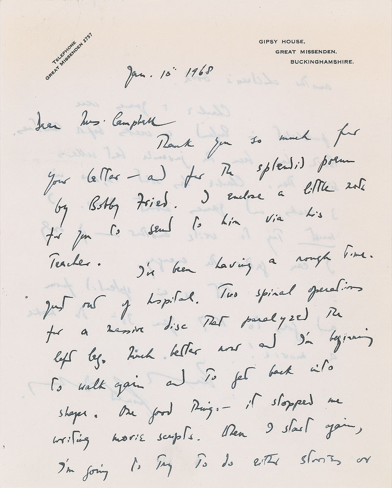 The second letter, January 10, 1968, in part: “I’ve been having a rough time. Just got out of hospital. Two spinal operations for a massive disc that paralyzed the left leg. Much better now and I’m beginning to walk again and to get back into shape. One good thing—it stopped me writing movie scripts. When I start again, I’m going to try to do either stories or another children’s book. Charlie & James were published in England 4 weeks before Christmas. Both have been the juvenile best sellers since then. Charlie has sold 12,000 in 3 weeks, and James about 8000. I must try to write another—if only I can gather the energy.”