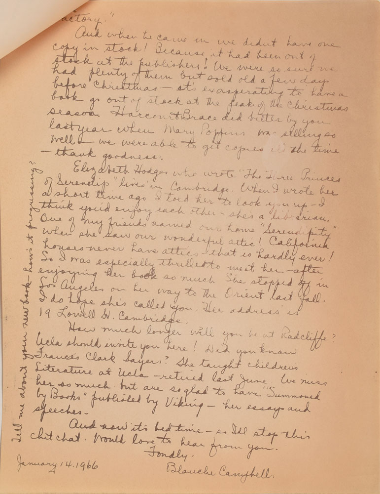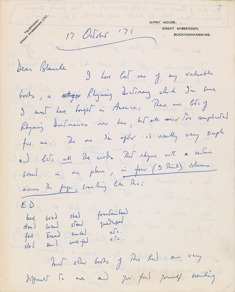 The last letter, October 17, 1971, in part: "I have lost one of my valuable books, a Rhyming Dictionary which I’m sure I must have bought in America. There are lots of Rhyming Dictionaries over here, but all are too complicated for me. The one I’m after is really very simple and lists all the words that rhyme with a certain sound in one place, in four (I think) columns across the page, something like this: ED / bed bred shed fountainhead / dead bread stead quadruped / fed tread embed etc. / sled said well-fed etc…The film of Charlie was pretty poor, wasn’t it? Those ghastly Oompa-Loompas—seven dirty old dwarfs—were horrible. I get nightmares about them…I am trying at last, as a result of a good deal of pressure from kids, to do a sequel to ‘Charlie.’ So far it’s coming out a bit odd, but that doesn’t worry me. What does worry me is where the hell we go when I finish the next chapter.” In overall fine condition, with staple holes to the upper left corner of each letter. Accompanied by a copy of a letter from Campbell to Mary Poppins author P. L. Travers, in which she explains that Dahl “was a frequent visitor to our Children’s Dept. when his wife was recuperating at the UCLA Medical Center which is right across the street from our store. He kept us supplied with autographed copies of ‘Charlie and the Chocolate Factory.”