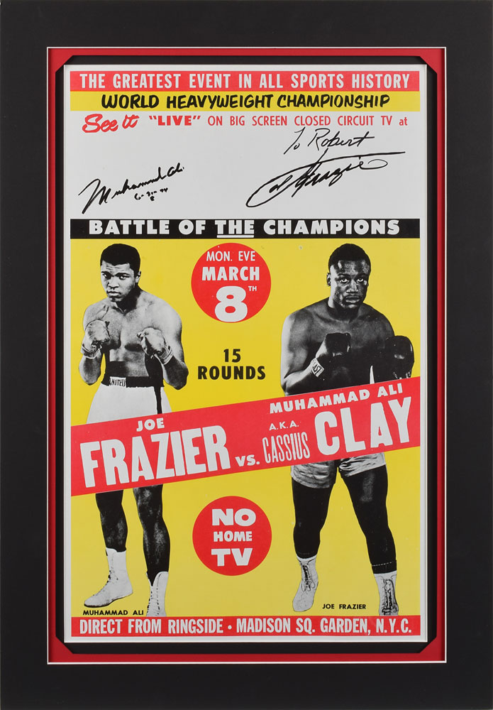 Attractive vintage color 13.5 x 21.25 poster promoting a closed-circuit viewing of the legendary first fight between Muhammad Ali and Joe Frazier at Madison Square Garden on March 8, 1971, signed in black felt tip, "Muhammad Ali, 6-30-94" and "Joe Frazier," with an unknown hand adding the inscription, "To Robert." Triple-matted to a slightly larger size. In fine condition.