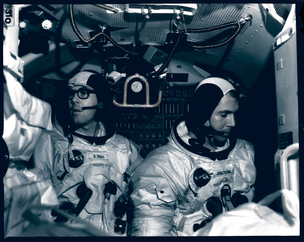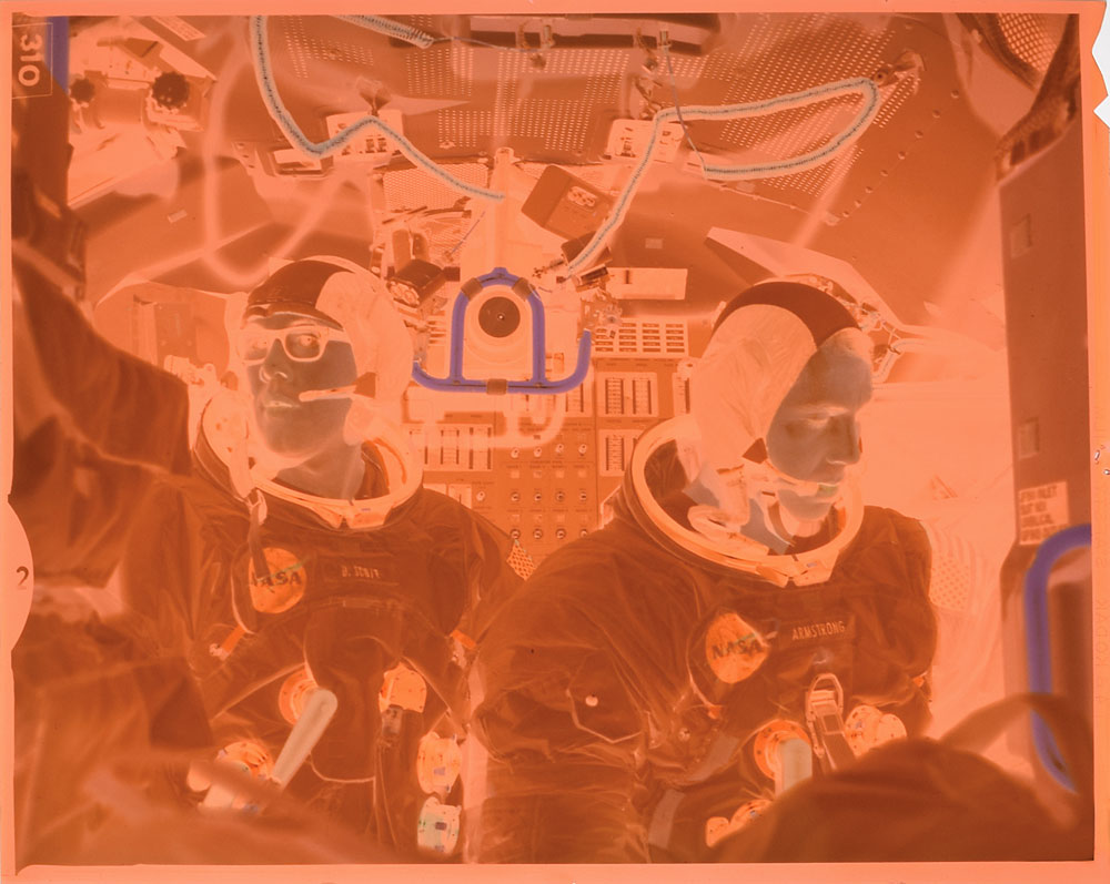 Rare large format 5 x 4 Kodak safety negative showing Dan Schaiewitz (in Neil Armstrong's suit) and another engineer in Dave Scott's suit during testing. In fine condition. As Extravehicular Crew Training Engineer at KSC, Schaiewitz wore space suits to help develop, troubleshoot, and verify procedures used by the astronauts. From the collection of Dan Schaiewitz, who worked as Extravehicular Crew Training Engineer at KSC. View Dan's many Collect Space posts here. Engineer Dan Schaiewitz gives us a fascinating firsthand glimpse into his experiences on the cutting edge of space exploration during the Apollo missions, in this podcast.