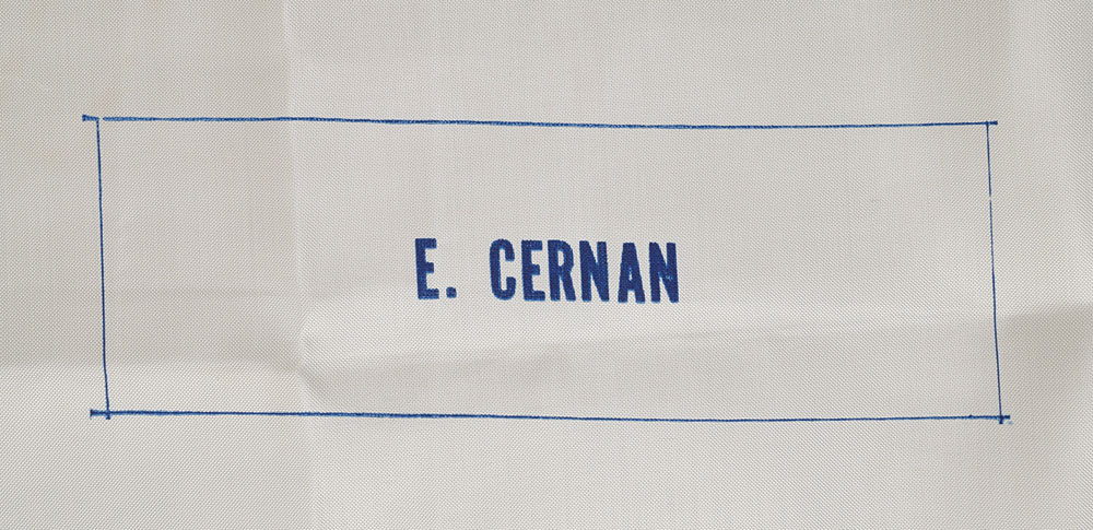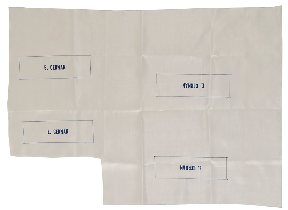 Uncut Beta cloth sheet of four dark blue "E. Cernan" name tags, each measuring 7.5 x 2.5, with the overall cloth measuring 28.5 x 22. In fine condition. From the collection of Dan Schaiewitz, who worked as Extravehicular Crew Training Engineer at KSC. View Dan's many Collect Space posts here. Engineer Dan Schaiewitz gives us a fascinating firsthand glimpse into his experiences on the cutting edge of space exploration during the Apollo missions, in this podcast.