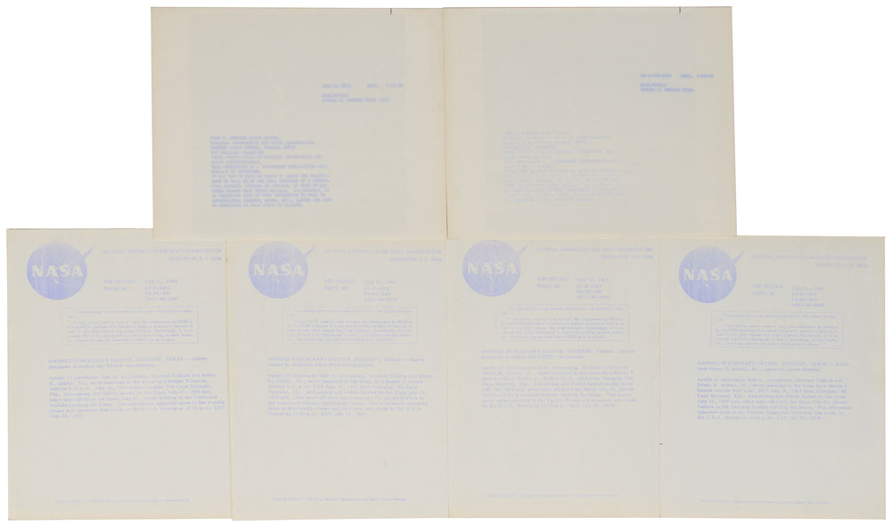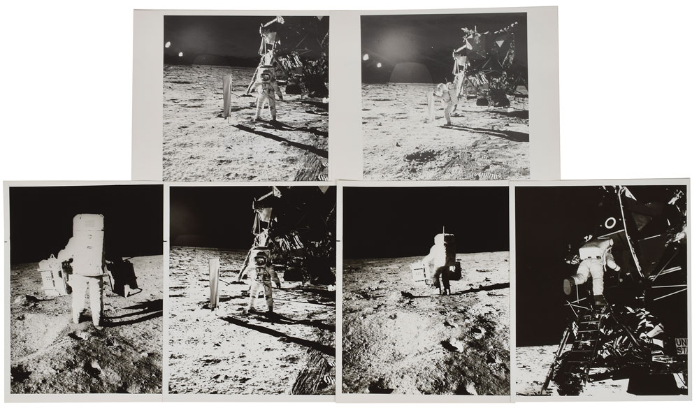 Set of six original vintage glossy NASA photos, ranging in size from 8 x 10 to 10.25 x 8, each depicting Lunar Module Pilot Buzz Aldrin during the Apollo 11 moon mission, with images including: an uncommon angle of Aldrin taking a large step as he descends from the top of the LM ladder; two images of Aldrin walking on the lunar surface carrying a pair of EASAP components; Aldrin as he sets up the Solar Wind Composition (SWC) experiment; and two images of Aldrin standing in front of the lunar module near the deployed SWC. Reverse of each photo bears official purple NASA caption text. In overall fine condition.